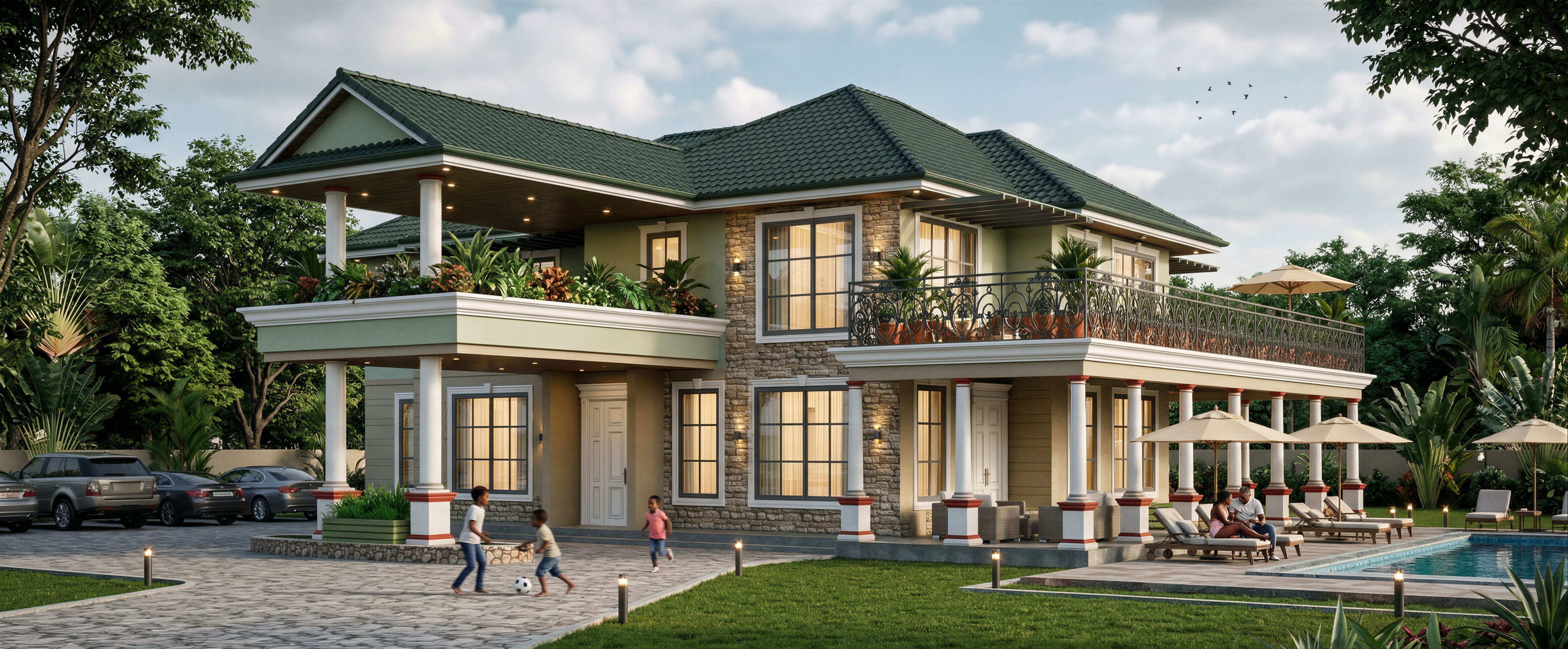 Include a swimming pool and resting areas. Some umbrella sitting areas around the pool area., keep exact camera angle. Turn the lights on in the building and house. Include some wall brackets, spot lights and garden lights. Make image high resolution 8k. Include some birds in the sky. Make Roof a darker shade of green.keep exact camera. Use the reference file but maintain original design., keep exact camera angle