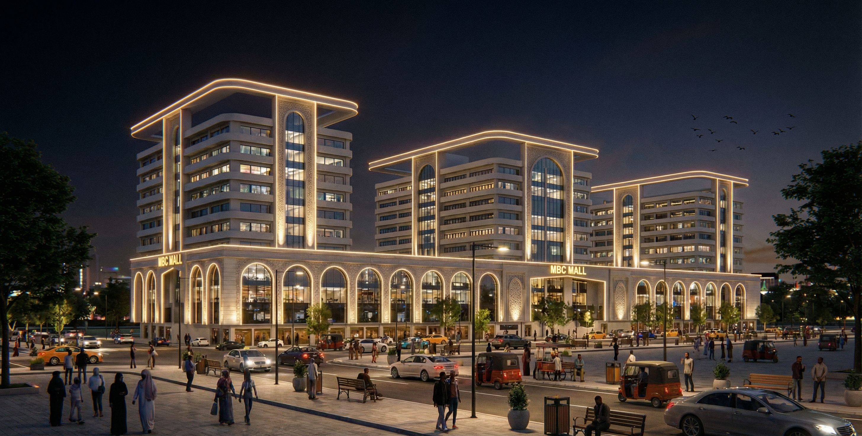 MAKE A BUILDING IN THE COMMERCIAL DISTRICT OF SOMALIA. INCLUDE MOULDINGS AROUND WINDOWS AND ALL OPENINGS AND ARCHES. GIVE THE BUILDING A CONTEMPORARY ARABIC CHARACTER. INCLUDE SOME BIRDS IN THE SKY., keep exact camera angle