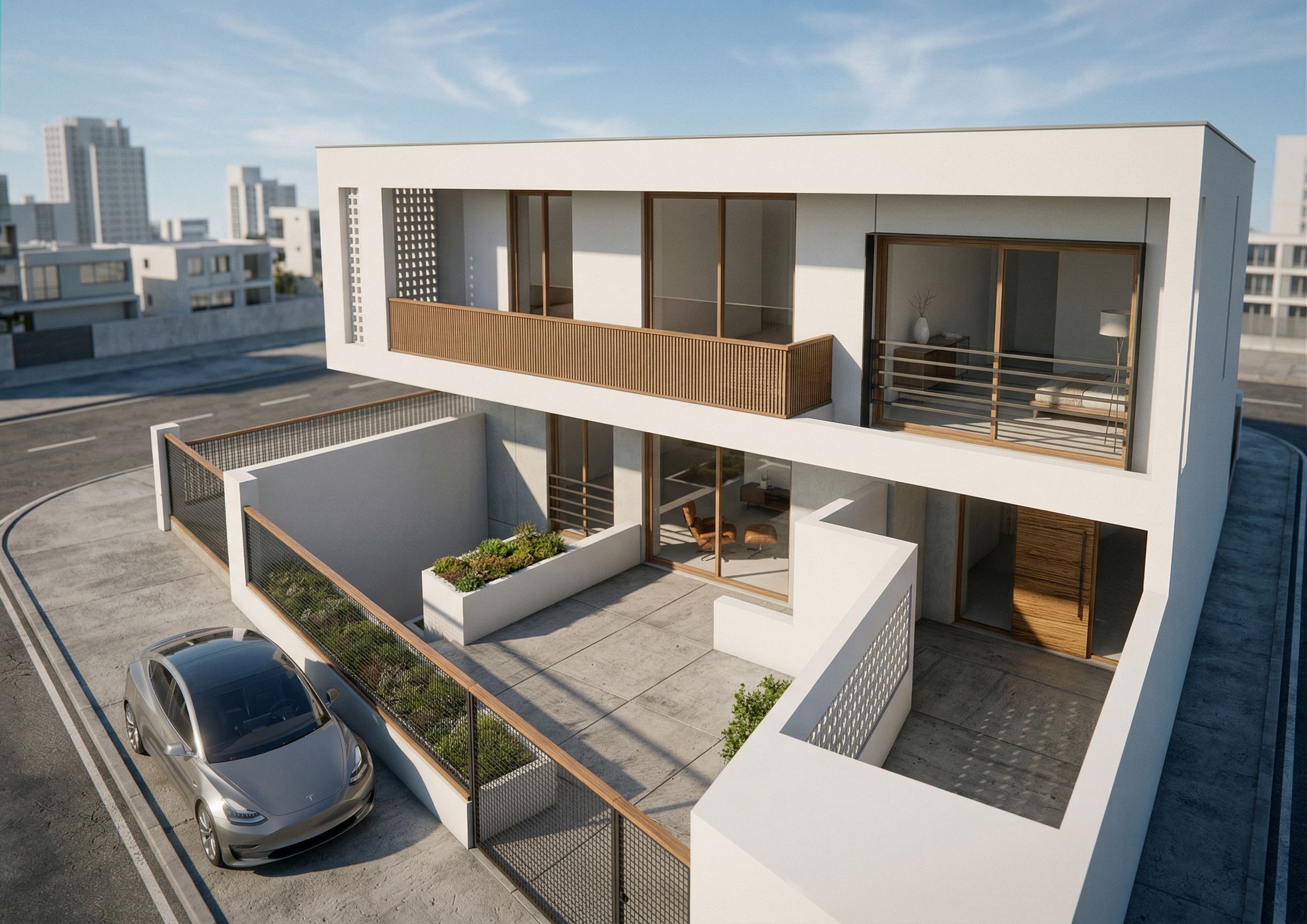 PromptPhoto of a contemporary residential building featuring clean lines and minimalistic design. Highlight the smooth white exterior walls, large glass windows, and wooden balcony railings. The surrounding urban environment includes a small grassy courtyard and sleek fencing and add a car . Natural daylight illuminates the scene, casting soft shadows on the surfaces. Captured from an elevated angle, using a wide-angle lens to emphasize space and depth, creating a dynamic and inviting perspective that showcases both the architecture and its context., keep exact camera angle