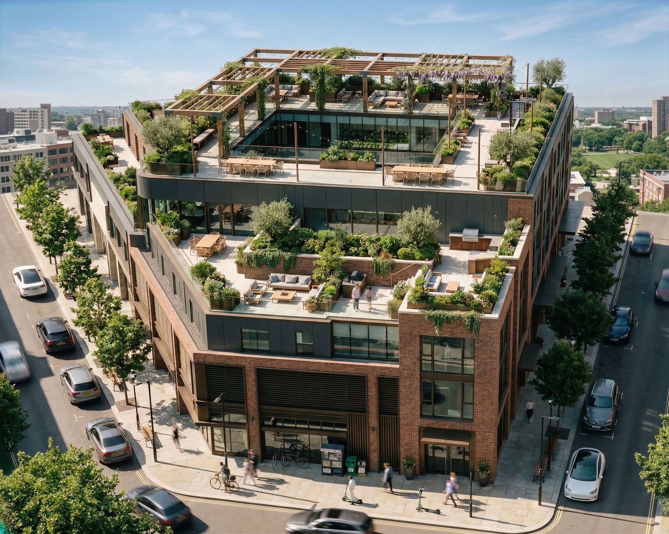 Prompt6 story buildings rooftop patio rooftop trellis rooftop tables rooftop chairs rooftop string lights, keep exact camera angle