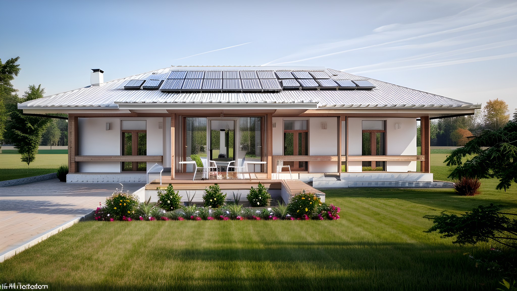 PromptSmall house in Romania, white plaster walls and wood, solar panel on roof, modern