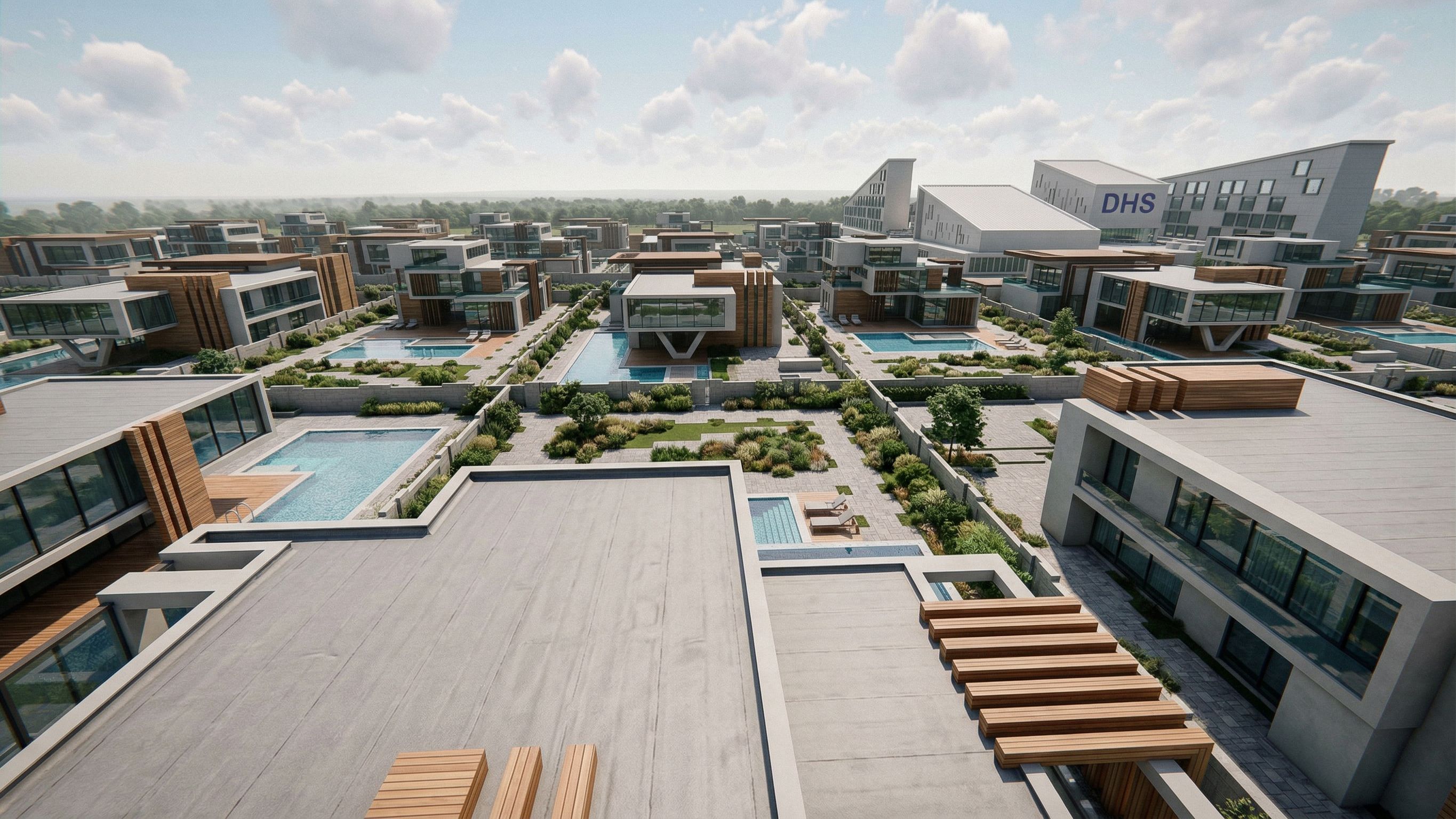PromptPhoto of a modern residential complex featuring sleek, minimalist structures with large glass facades and wooden accents. Emphasize the landscaped surroundings, including multiple swimming pools and greenery interwoven within the paved walkways. The scene is set under bright daylight, with soft shadows cast by the clouds, enhancing depth. Capture a bird’s-eye view angle, showcasing the interconnectivity of the buildings and outdoor spaces, using a wide-angle lens to convey a sense of spaciousness and harmony within the urban environment., keep exact camera angle