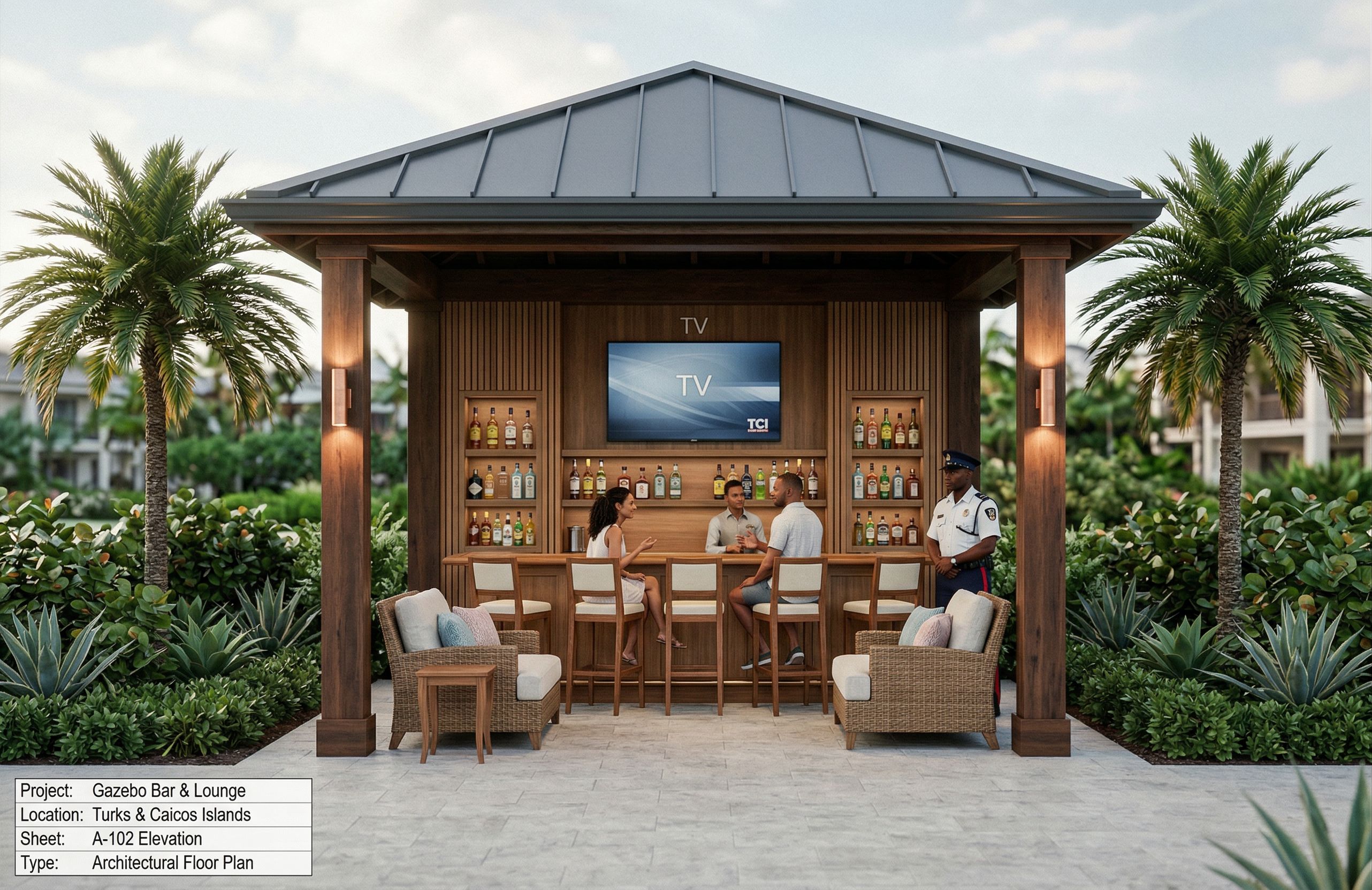 Generate a gazebo elevation with 8x8 inches stain wood columns, bar stools, shelving with bottle drinks, civilians a police, grey sanding steam roof mounted lights on columns Turks and Caicos Islands vegetation no ocean views, keep exact camera angle