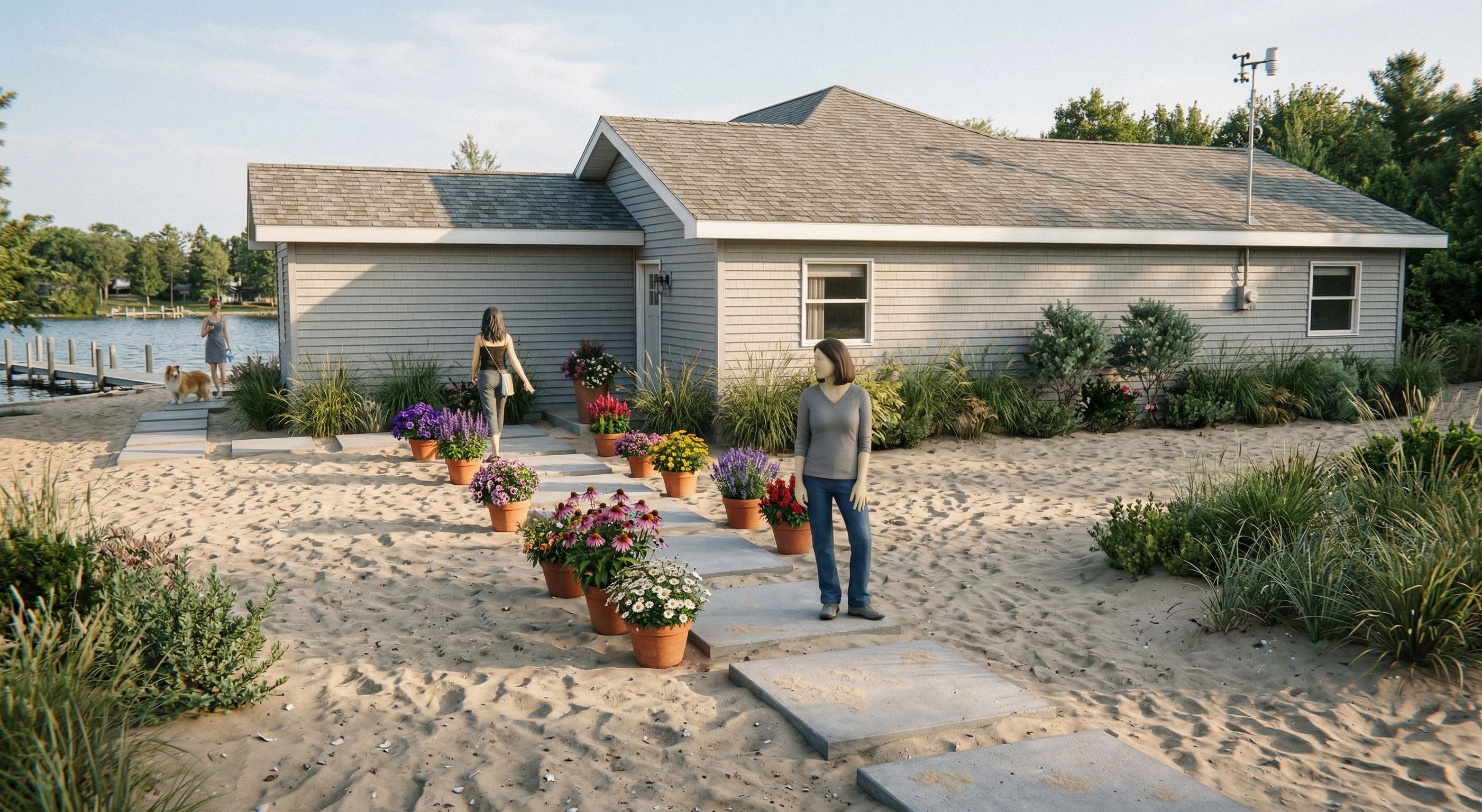 PromptPhoto of a single-story residential beach home situated in a serene beach sand environment. Emphasize the light gray lap siding siding, gabled roof, and vibrant flower arrangements along the walkway. Surrounded by lush greenery and a nearby lake, create a tranquil atmosphere complemented by soft, natural sunlight highlighting the landscaping. Capture the scene from a slightly elevated angle to include the front porch and pathway, using a wide-angle lens to frame the home and its inviting entrance, showcasing warm shadows and inviting ambiance. sand beach , keep exact camera angle