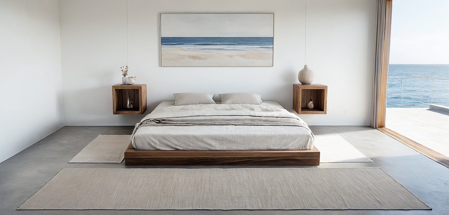 Sketch drawing of a japanese style bed with pastel color linen sheets. Two nogal wood cube cabinets on each side of the bed. White wall with a minimalistic painting above the bed. Window with a view to the ocean on the right side with some linen curtains. Custom cabinets on the left. Light grey microcement flooring.
