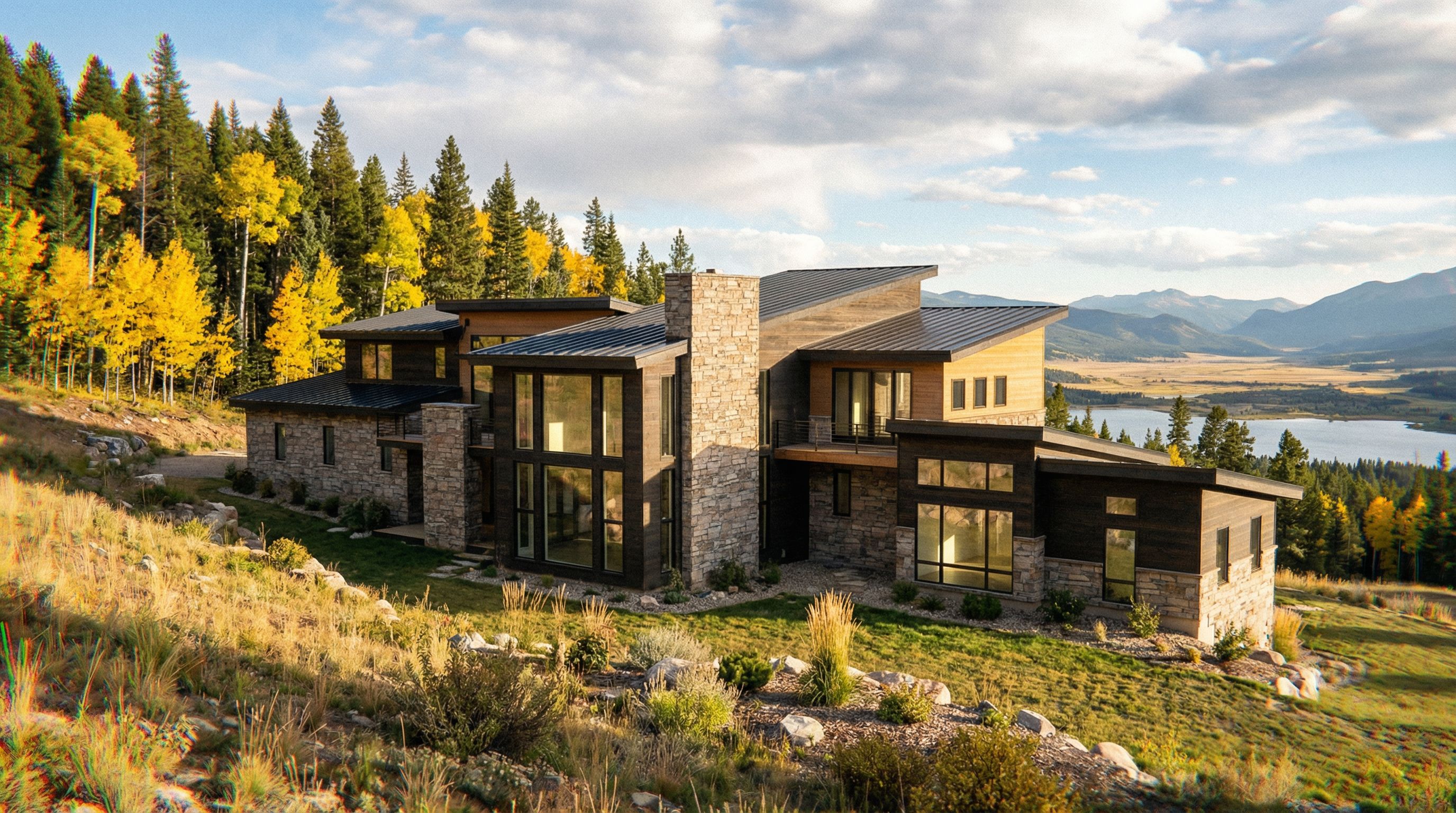 PromptThis view will be looking up a hill. This is the back of the house so no driveway is visible. Place minimal landscape in front of the house. place pine trees and yellow aspen trees in the back on the left. The right side have western twin lakes in the background. The roofs should be standing seam metal without snowguards unlike the shingles shown. The main materials will be stone, a dark wood-stained siding and a light stained wood siding. Have the valley looking toward Leadville in the background. This house will be in Twin Lakes Colorado. keep exact camera angle., keep exact camera angle