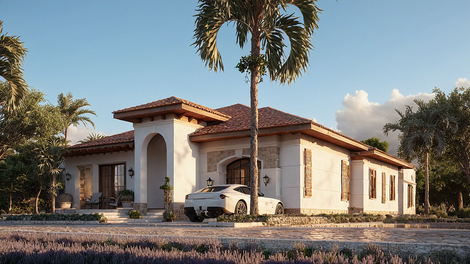 PromptHyper-realistic render of a Mediterranean-style home with terracotta roof tiles, white stucco walls, wooden shutters, and a stone-paved patio. Surrounded by olive trees, lavender bushes, and a sea view in the background. Golden hour lighting, realistic shadows and reflections, 8k resolution, cinematic composition, ultra-detailed textures.