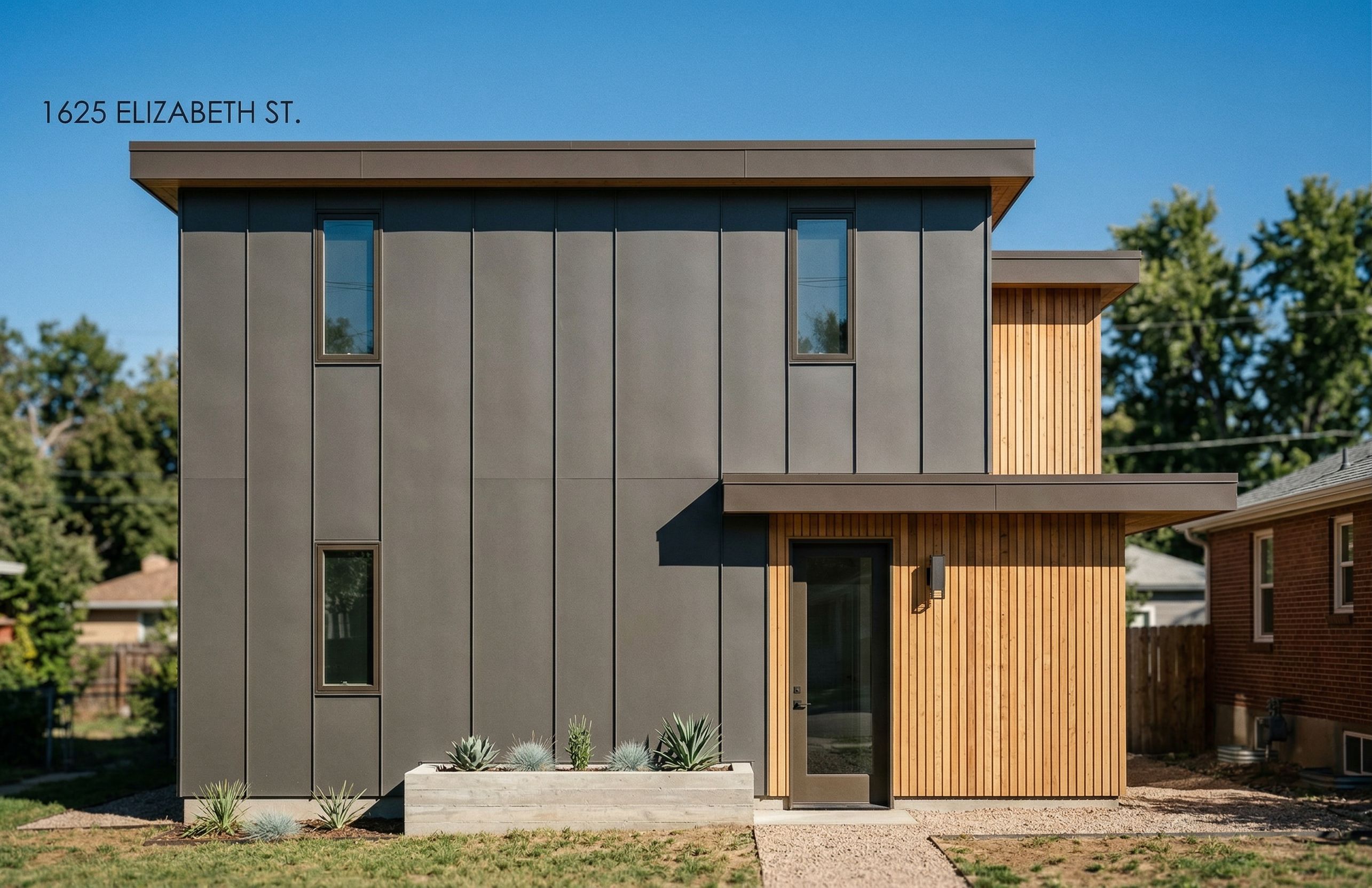 keep the exact same materials of the wood and metal as the last rendering. This again will be a 2-dimensional render of an ADU. This ADU will be in Denver Colorado. keep the elevation the same as in the image. do not add or change the windows, door, or roof. Place minimal landscaping at the front. , keep exact camera angle
