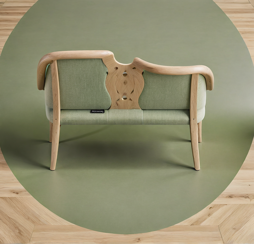 Promptback view modern bench, closed back, soft green fabric seating, light wood structure, beige background