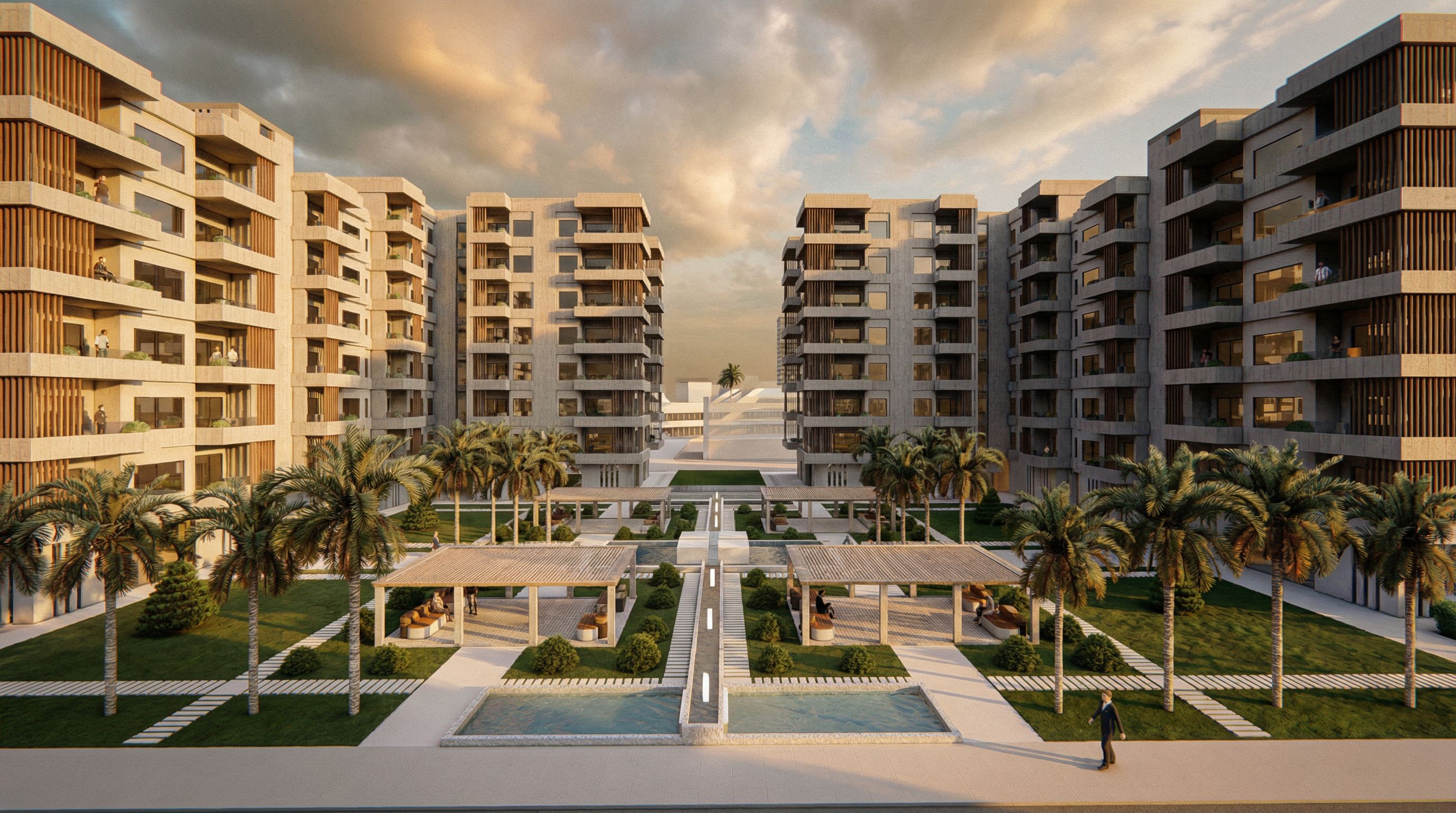 PromptPhoto of a modern residential complex featuring multiple contemporary apartment buildings with balconies. Architectural details include textured concrete facades, wooden accents, and large glass windows. The urban setting encompasses green landscaped areas with palm trees, a swimming pool, and shaded seating zones. The scene is illuminated by soft afternoon sunlight, casting gentle shadows and enhancing the textures of the materials. Captured from a low angle to emphasize the height of the buildings, using a wide-angle lens for a dynamic perspective of the surrounding landscape.