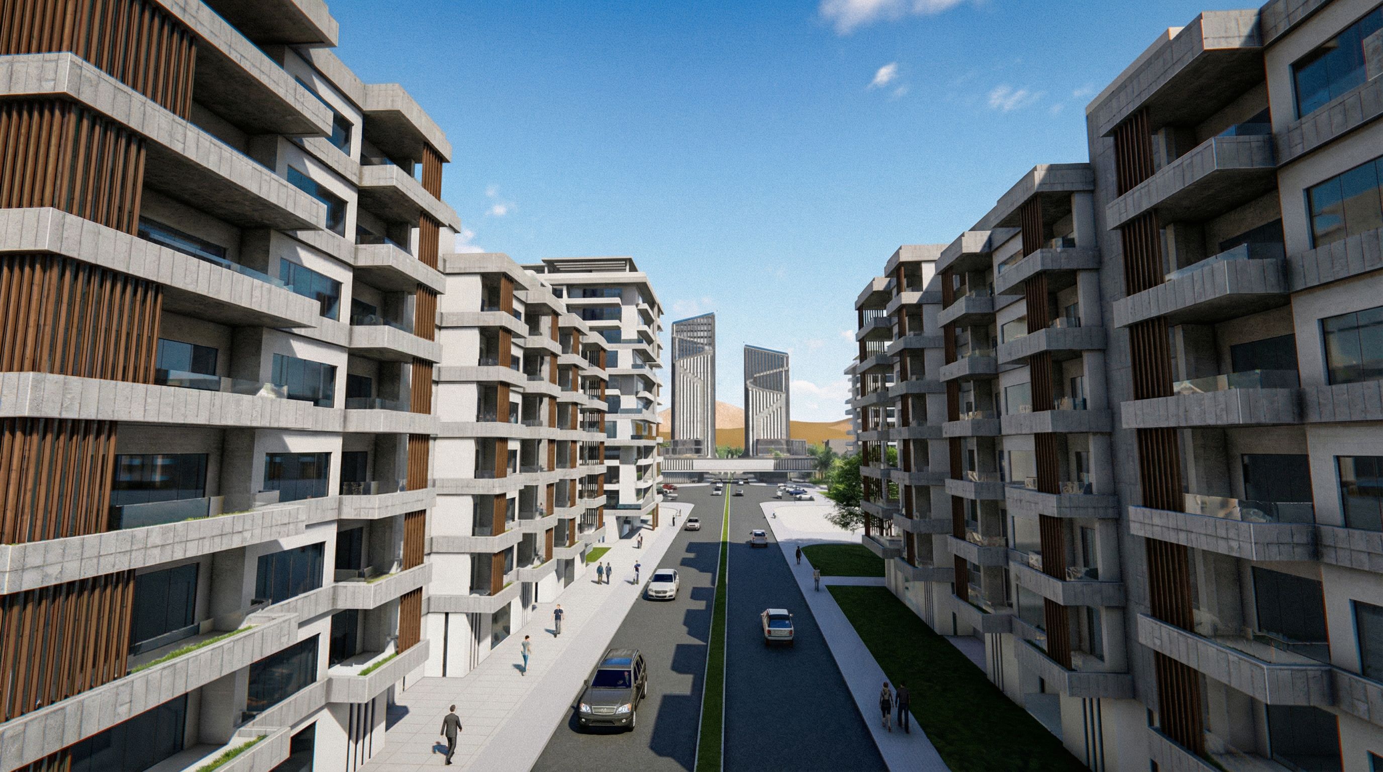 PromptPhoto of a modern multi-story residential complex featuring sleek balconies and a blend of concrete and wooden elements. The urban setting includes nearby high-rise towers Natural daylight illuminates the scene, casting soft shadows and enhancing textures. Captured from a slightly elevated angle, the framing leads the eye down the street toward the distant structures, using a wide-angle lens to emphasize depth and perspective. don't add greenery out of the main image let the median strip without trees , keep exact camera angle