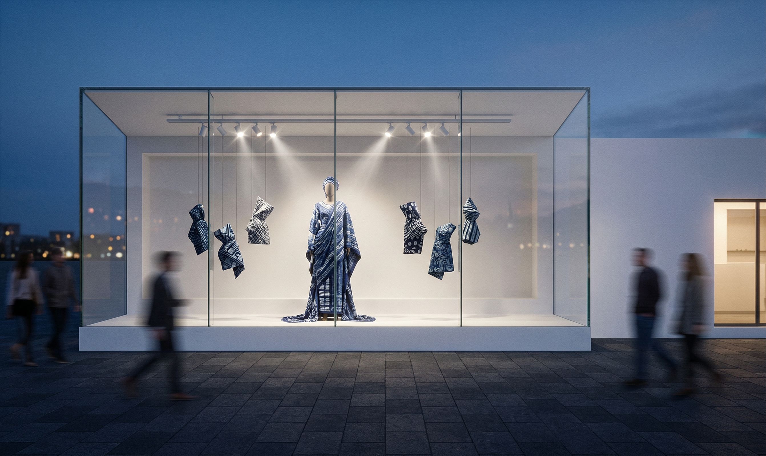 External vitrine showcase, with a creatively adire clad mannequin inside, track lights beaming on the display, clean and sophisticated, people passing by in long exposure, 4k, realistic view, plexiglass, lighting , keep exact camera angle