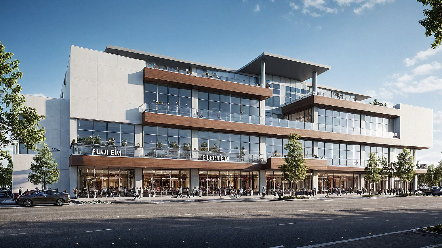 Promptshopping mall, cars, trees, people, realistic rendering, modern facade, realistic sky, parked cars, lighting on the facade, small trees in front of the building, people walking, cars passing by