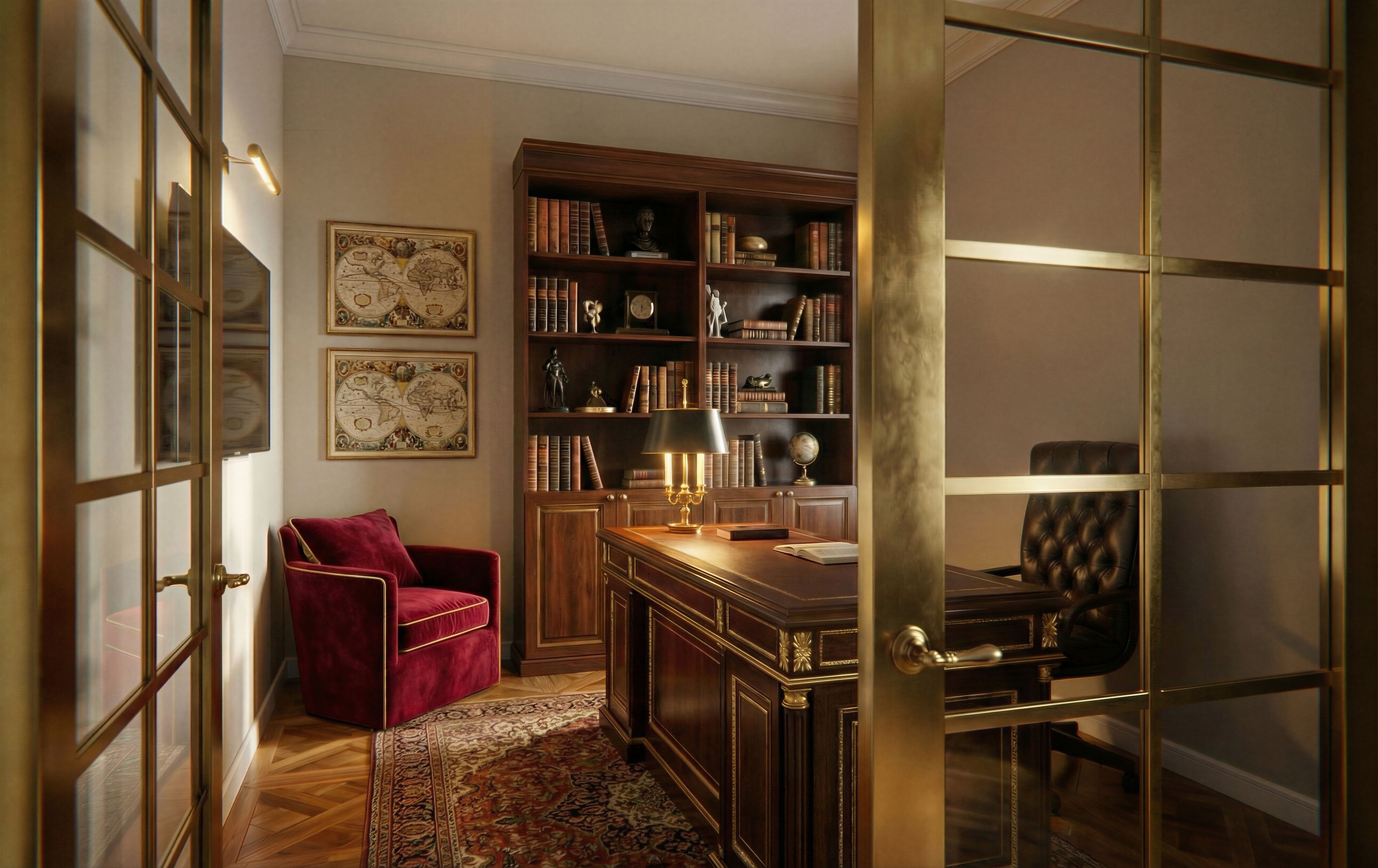 Delete window and curtains on the right wall. No bookcase on the right wall behind the desk chair. Replace picture on the back wall above the seat with 2 vintage maps aligned vertically. Replace picture on the left wall with TV on that wall. No door handle on the right door., keep exact camera angle