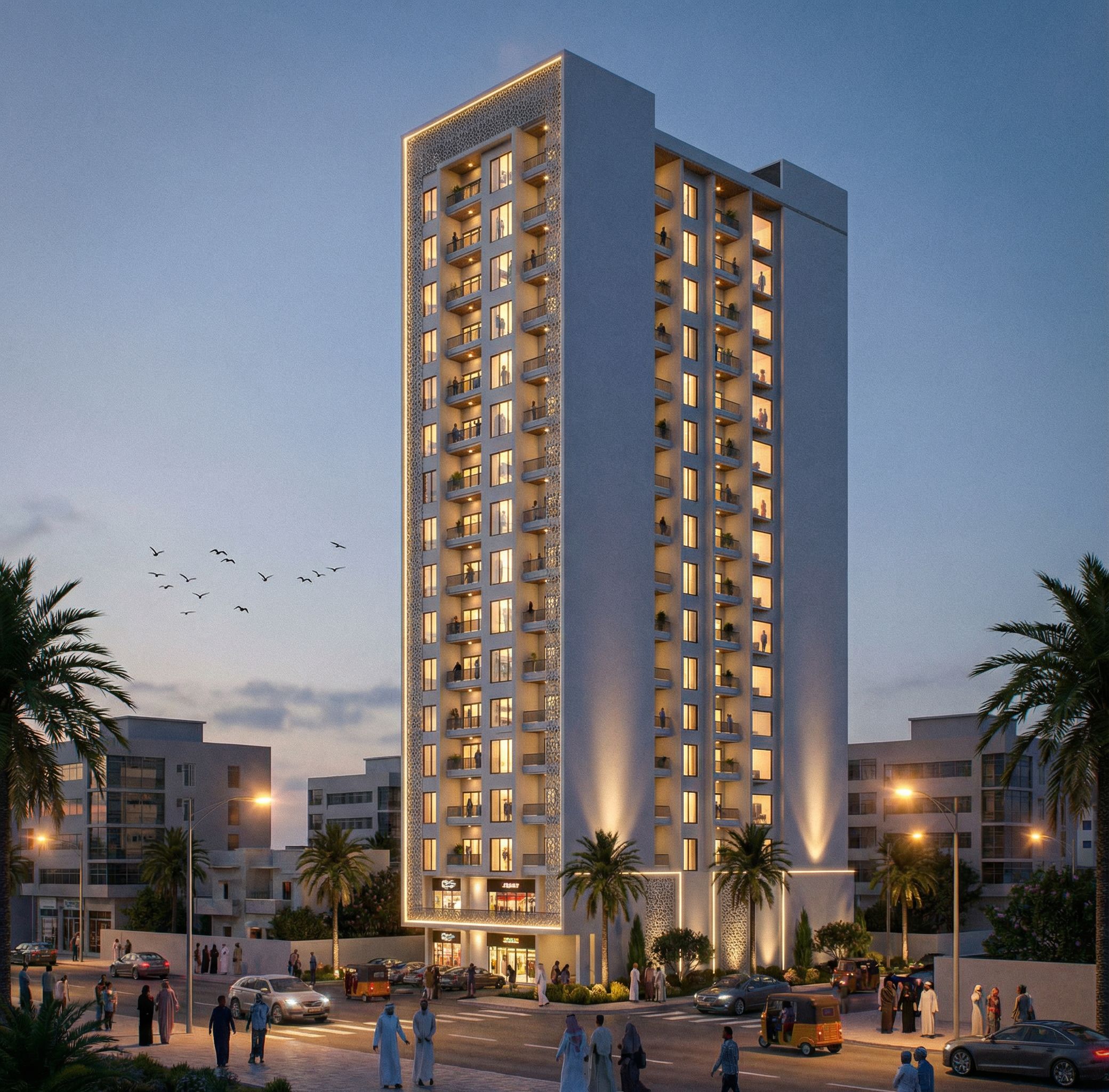 Perspective of a 16 storey building with ground and first floor as commercial spaces and second to sixteenth floors as apartments. Turn on the lights in the building. Use spot lights and rope lights in the building and introduce street lights. Use white wall master on the building and introduce people of somalia origin on the street. Introduce some birds in the sky and the environment a commercial building in Mogadishu Somalia. Use palm trees as landscaping., keep exact camera angle