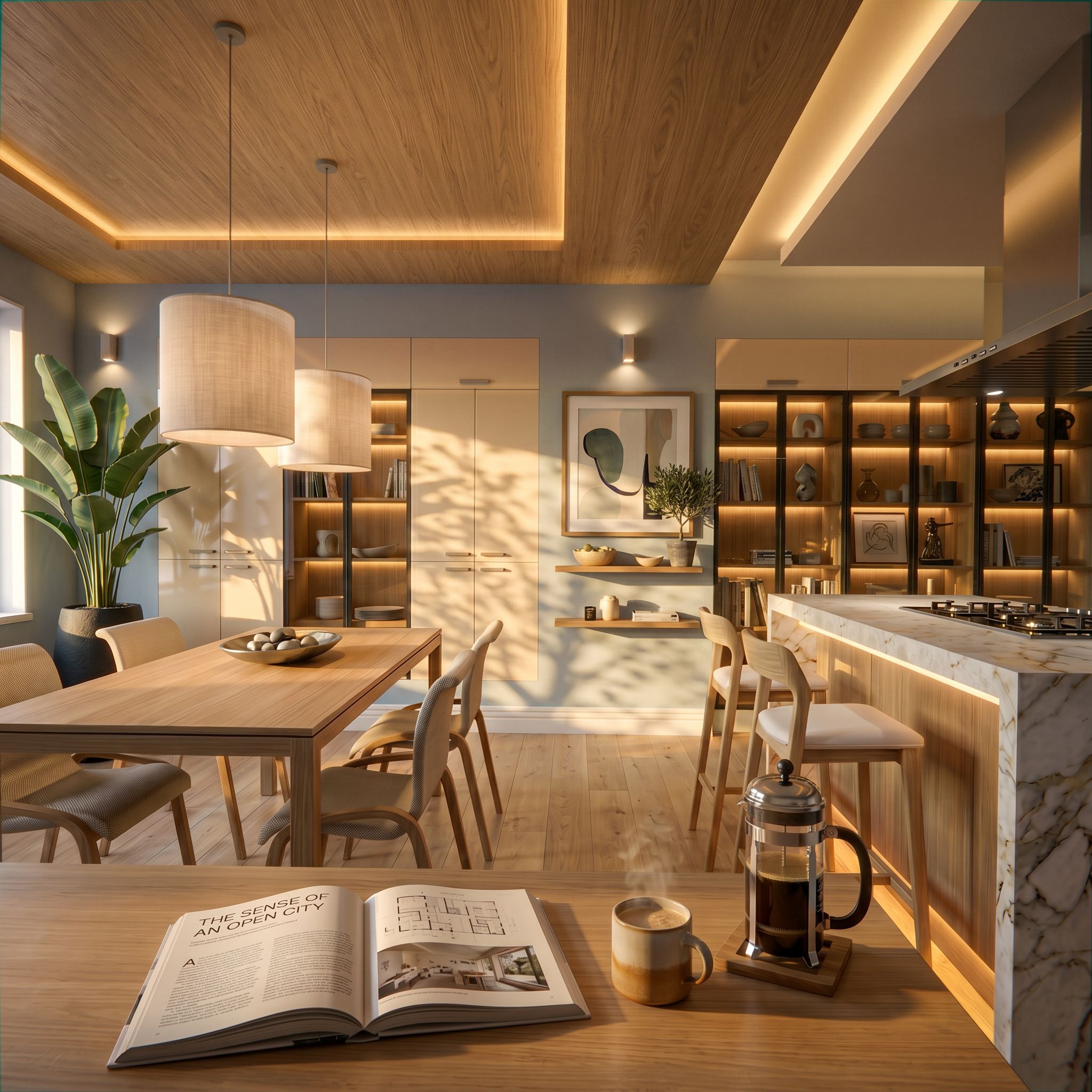 PromptElimina las plantas colgantes que están en las estanterías. Añade sobras a la luz que entra por la ventana como si hubiera un árbol por fuera que deja pasar la luz y genera un sutil contraste de luces y sobras. Elimina la luz que está debajo de la barra de la cocina y respeta la luz que está en el zócalo de la isla. Añade en el hueco del techo que está sobre la mesa, el mismo acabado del mismo suelo como un revestimiento de madera., keep exact camera angle