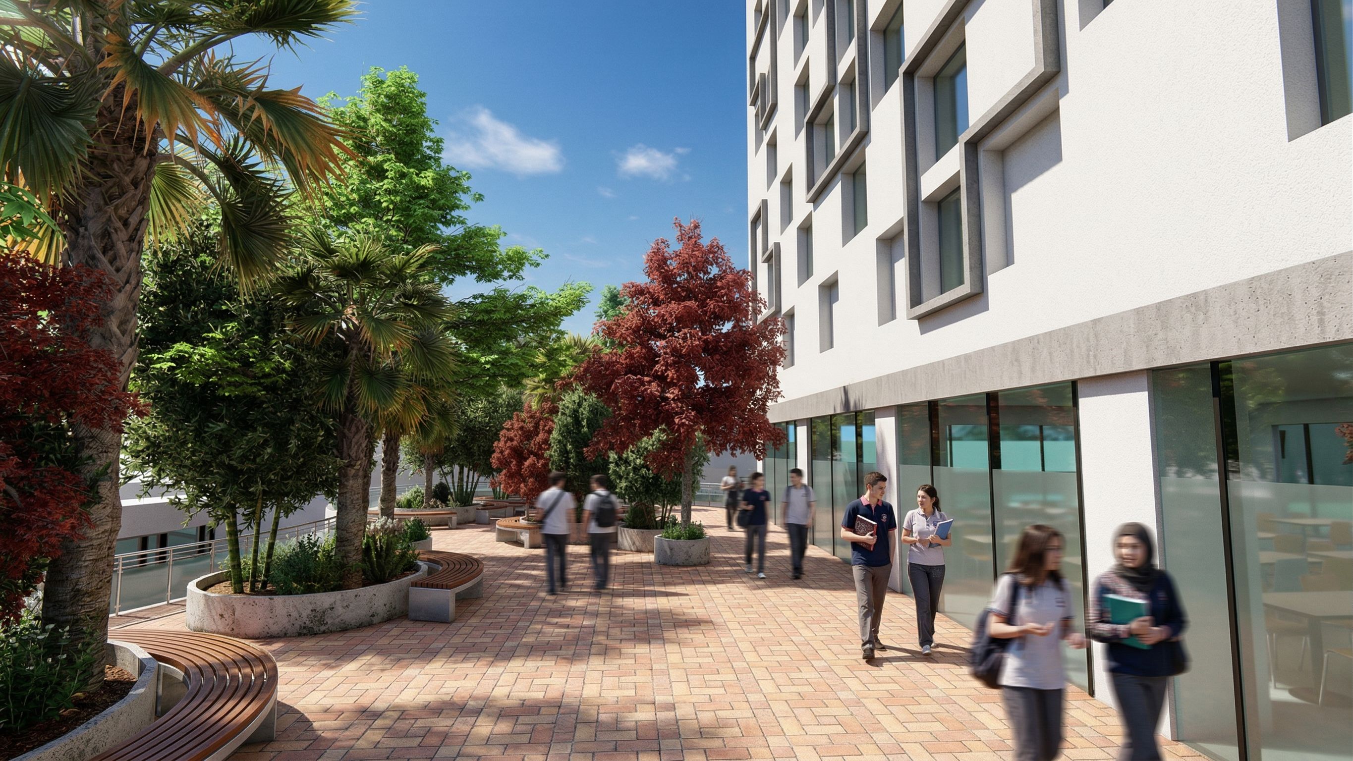 Promptthis is top of the roof of a modern Syrian (Arab) high school and it shows an interactive area and a cafeteria where the students relax and have their lunch and walk around you can add outer benches to sit out side enhance materials and make the scene super realistic don't add windows above , keep exact camera angle