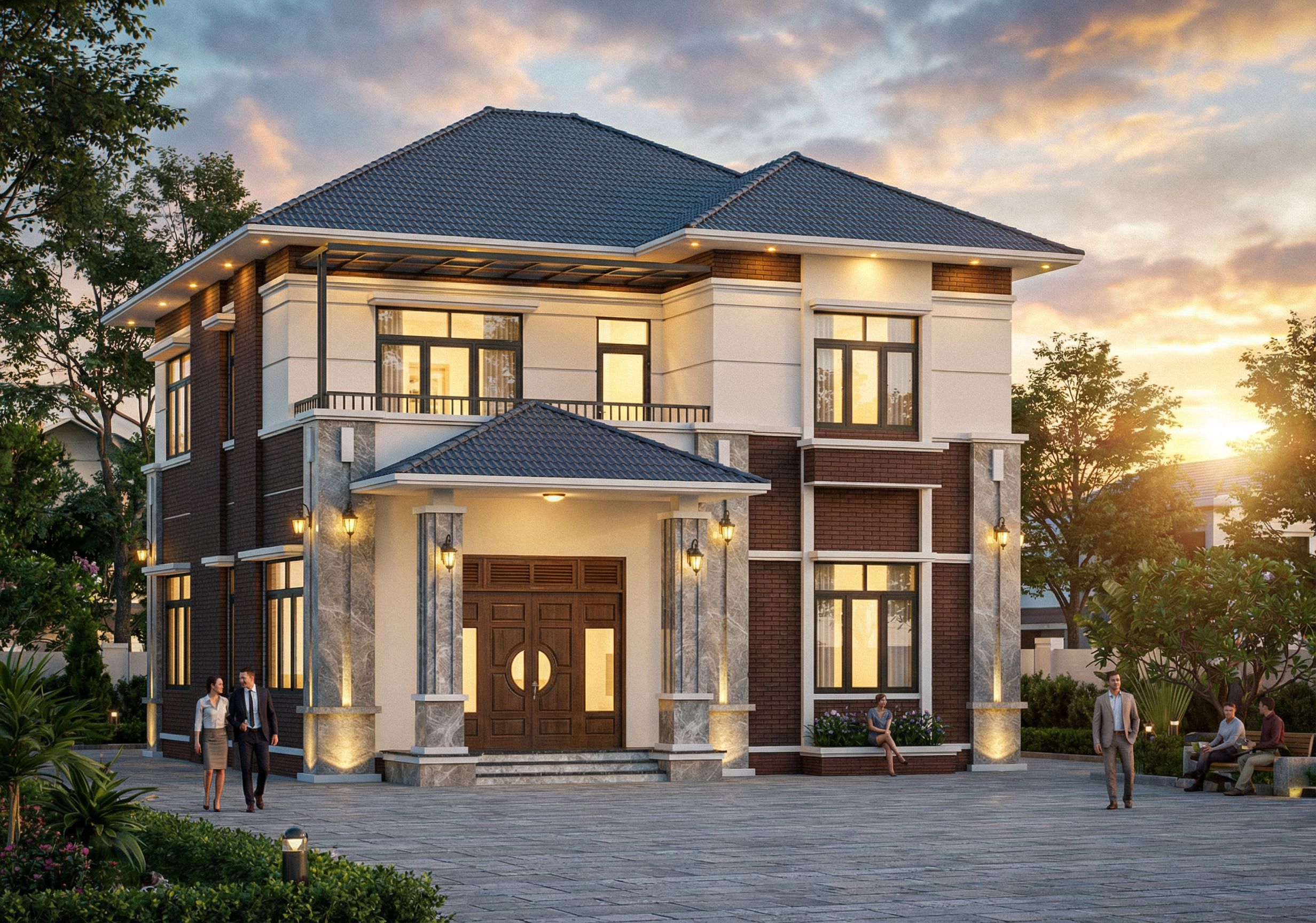 The photograph depicts a two-story residential building with a triangular roof, characteristic dark gray-blue tiles, and a grand entrance. The emphasis is on the textured facade, showcasing deep brown brickwork and a smooth, ivory-white painted plaster finish, along with ornate columns and natural gray stone cladding with subtle veins, and elegant lamps placed on either side of the entrance. The setting is a suburban area surrounded by lush greenery. In front of the house is a spacious courtyard paved with gray natural stone. The setting sun creates soft shadows, combined with lights under the balconies and spotlights at the base of the columns, highlighting the building's architectural features. The photograph emphasizes the architectural materials and realistic lighting. The entire structural design is preserved. The low-angle shot, maintaining the original design perspective, uses a wide-angle lens to emphasize the building's majestic presence against the sky, creating a magnificent and inviting atmosphere., keep exact camera angle