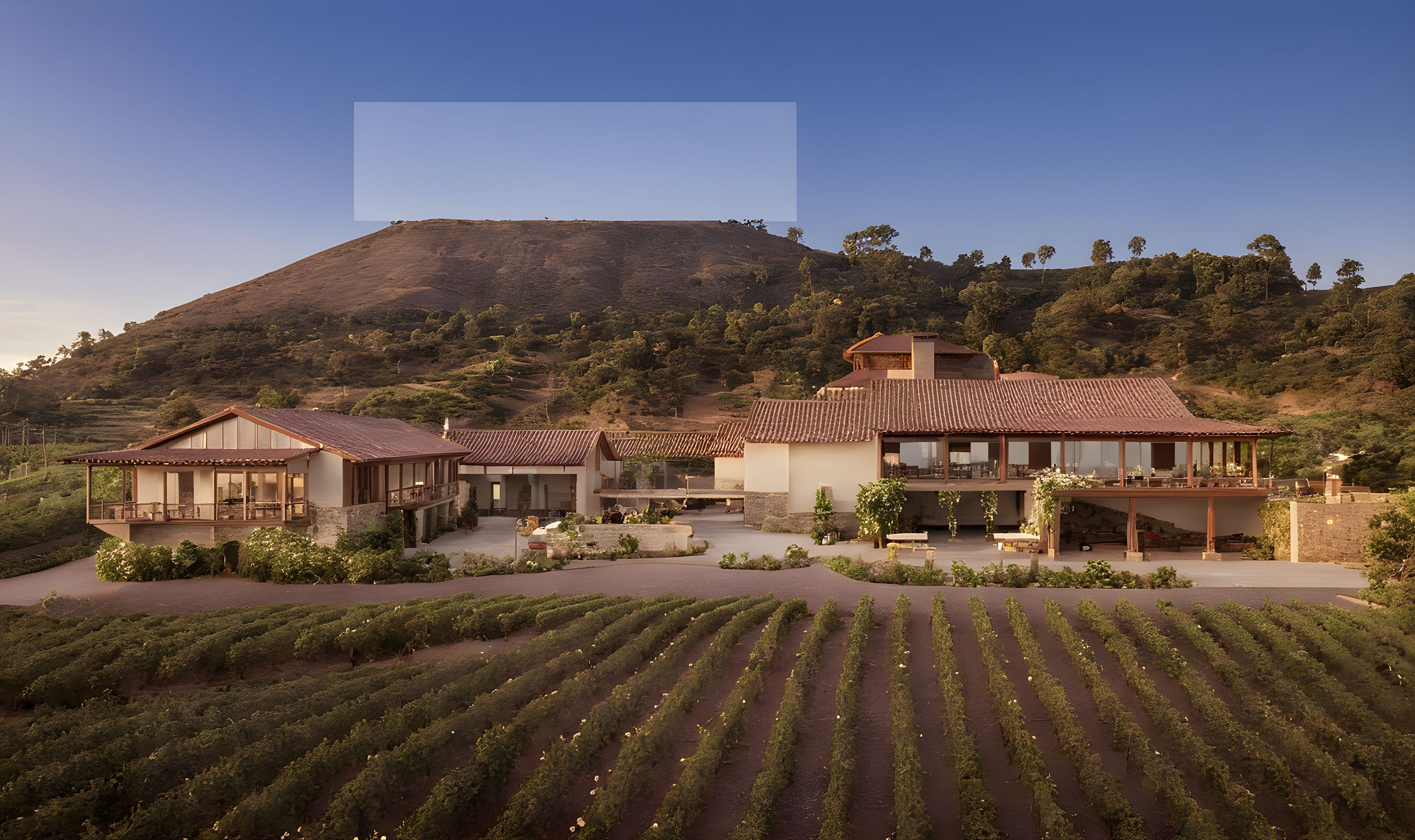 PromptMorning View of a boutique winery, placed amidst dense vineyards in the forefront and a mountain covered with dense forest in the backdrop. the render should highlight the architecture.