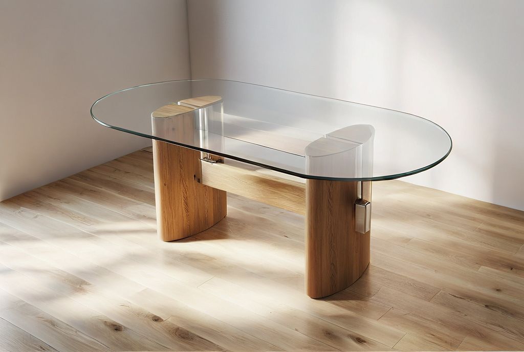 PromptREALISTIC RENDER OF A TABLE WITH CLEAR GLASS TOP, OAK LEGS AND POLISHED CHROME BEAM