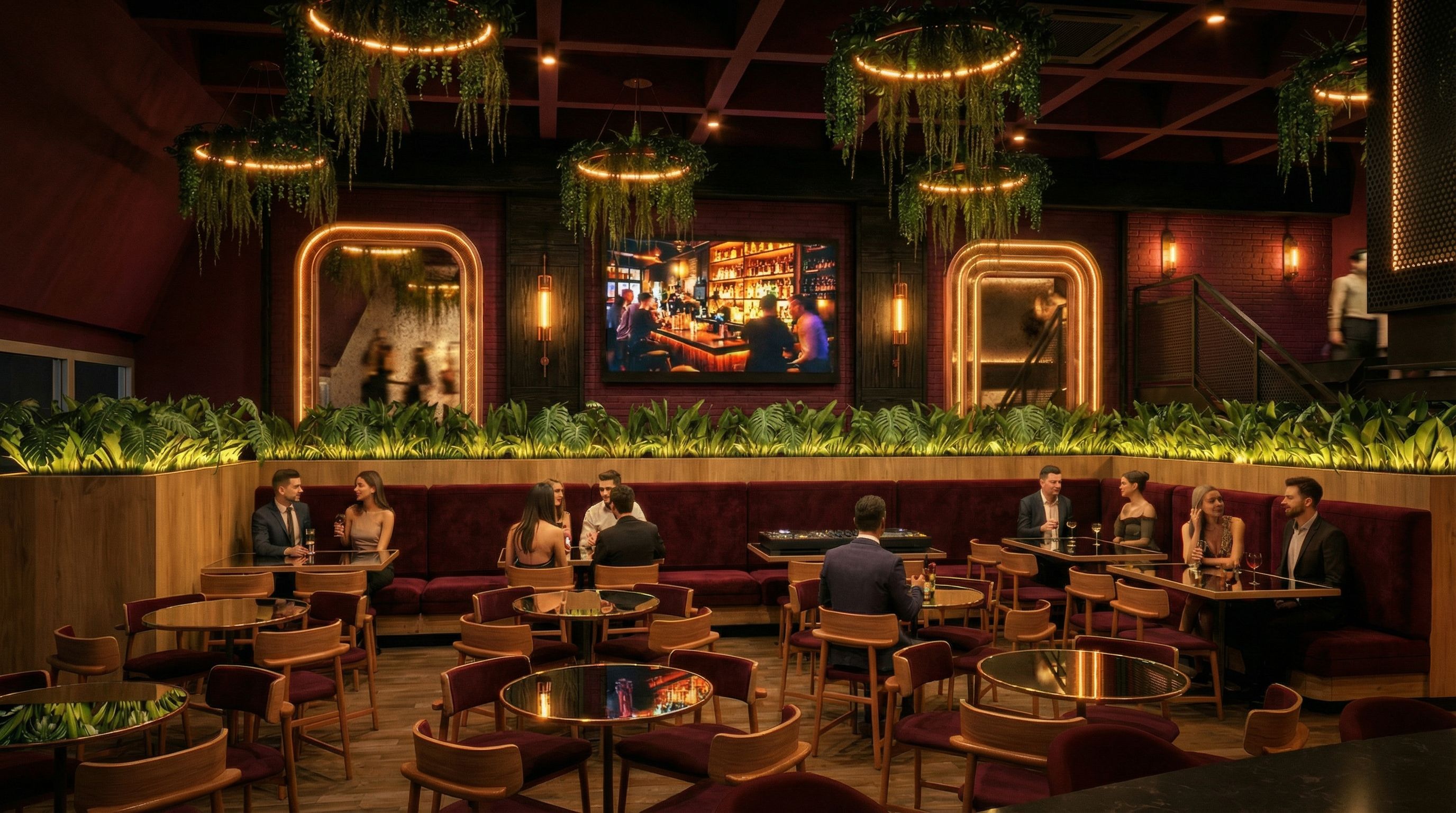 PromptGenerate a render in the perspective of the uploaded image, using the widest lens. HIGH-END PHOTOREALISTIC INTERIOR RENDER OF A MODERN CANTINA RESTAURANT NAMED BRASA NEGRA.NIGHTTIME ATMOSPHERE WITH AN ELEGANT, VIBRANT AND FESTIVE BAR MOOD INSPIRED BY GLOWING EMBERS AND FIRE GRILLING. DARK AND SOPHISTICATED ENVIROMENT WITH WARM AMBER AND COOPER LIGHTING ACCENTS THAT CREATE A LIVELY NIGHTLIFE EXPIREINCE. CERAMIC WOOD-LOOK FLOORING IN 18X60 CM PLANKS. LUXURY BOOTHS UPHOLSTERED IN AGED VELVET FABRIC IN WINE COLOR, COMBINED WITH NATURAL LIGHT BROWN WOOD BACKRESTS AND ARTIFICIAL GREENERY ABOVE THE BOOTHS. EXPOSED WINE COLOR CONCRETE WAFFLE SLAB CEILING WITH DRAMATIC SHADOWS. WINE COLOR PAINTED BRICK FEATURE WALL FOR DEPTH AND CONTRAST. TV WALL FRAMED SHOU SIGU BAN CHARRED WOOD PANELS. VINTAGE WALL LAMPS ON BOTH SIDES EMITING WARM, LOW LEVEL LIGHT. TWO ARCHITECTURAL ARCHES MADE OF 2-INCH METAL TUBING PAINTED COOPER, SIDE-LIT WITH AMBER LED STRIP LIGHTING, WITH AGED MIRROR BACKGROUND REFLECTING WARM LIGHT AND MOVEMENT.SUSPENDED CIRCULAR CEILING STRUCTURES WITH ARTIFICIAL PLANTS AND INTEGRATED WARM LED LIGHTING, CREATING A FLOATING GARDEN EFFECT, STAIRCASE SIDE COVERED WITH BLACK PERFORATED METAL SHEET, SUBTLY BLACKLIT. Bull sculpture next to railing similar to the one shown in the photo, made of steel and metal. Tables with mirrored tops and wooden chairs in the same tone as the back of the booth. CINEMATIC LIGHTING, HIGH CONTRAST, REALISTIC REFLECTIONS, DEPTH OF FIELD. LUXURY NIGHTLIFE HOSPITALITY DESIGN, ULTRA DETAILED MATERIALS, PREMIUM TEXTURES, PROFESSIONAL ARCHITECTURALVISUALIZATION, remove the bull.,8K QUALITY, keep exact camera angle