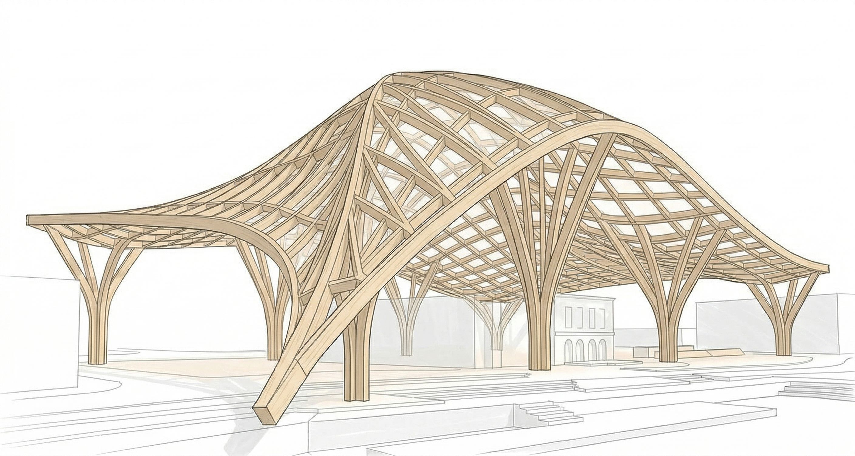 PromptModify this 3D structural axonometric model of the roof. Change the view to a more side-oriented 3D perspective, similar to a front or side elevation in space, so the structure is clearly visible. View Rotate the camera to a low side perspective Show the structure from human eye level or slightly below Emphasize depth, height and layering of the structure The view should clearly show: main ribs secondary beams branching columns Focus Make the structural system readable Highlight how the roof rises and slopes down Show how the structure is supported by columns Composition Keep the entire roof structure visible Lightly show the building footprint below for reference No surrounding clutter Style conceptual architectural 3D model clean white background light wood material no textures no people Important do not change the geometry of the structure only change the camera angle and view no text no labels, keep exact camera angle