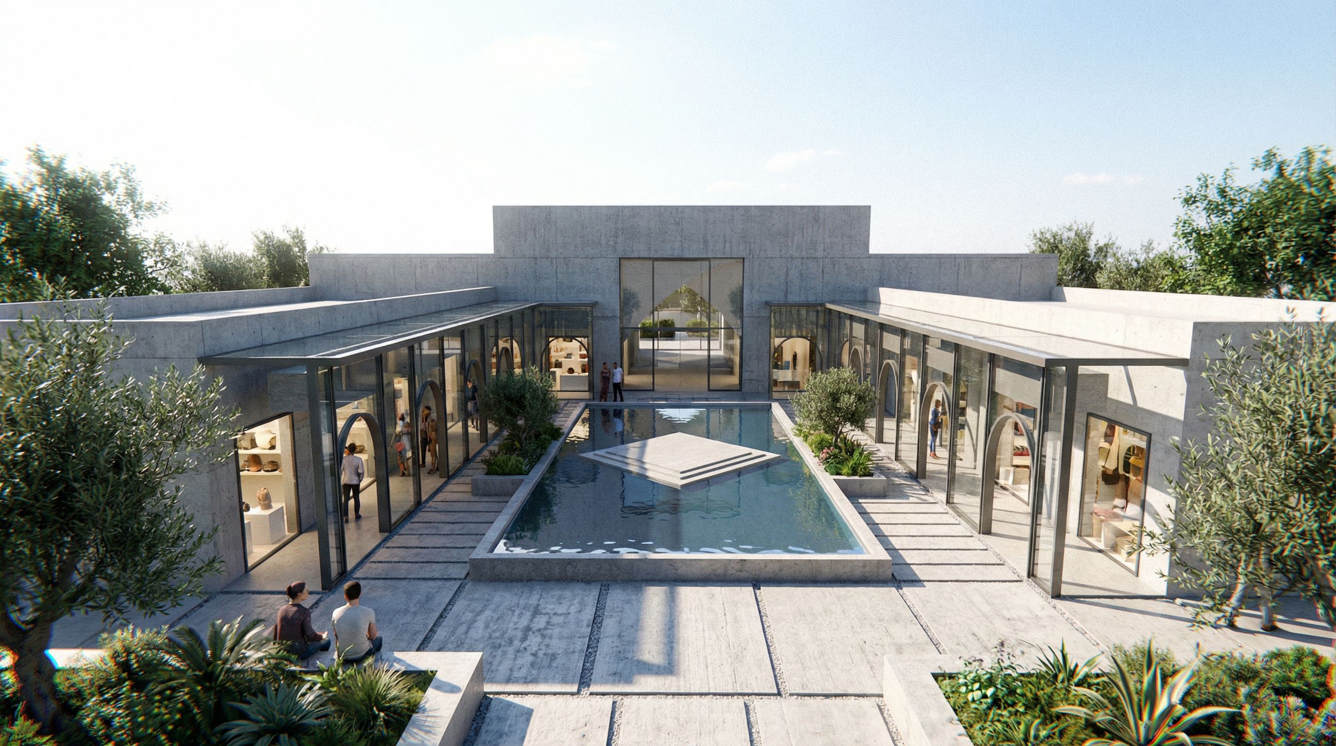 this is a courtyard of a traditional building of crafts and hand made products .. make this scene real and change the colors and add materials as you want just make the whole scene super realistic and well designed