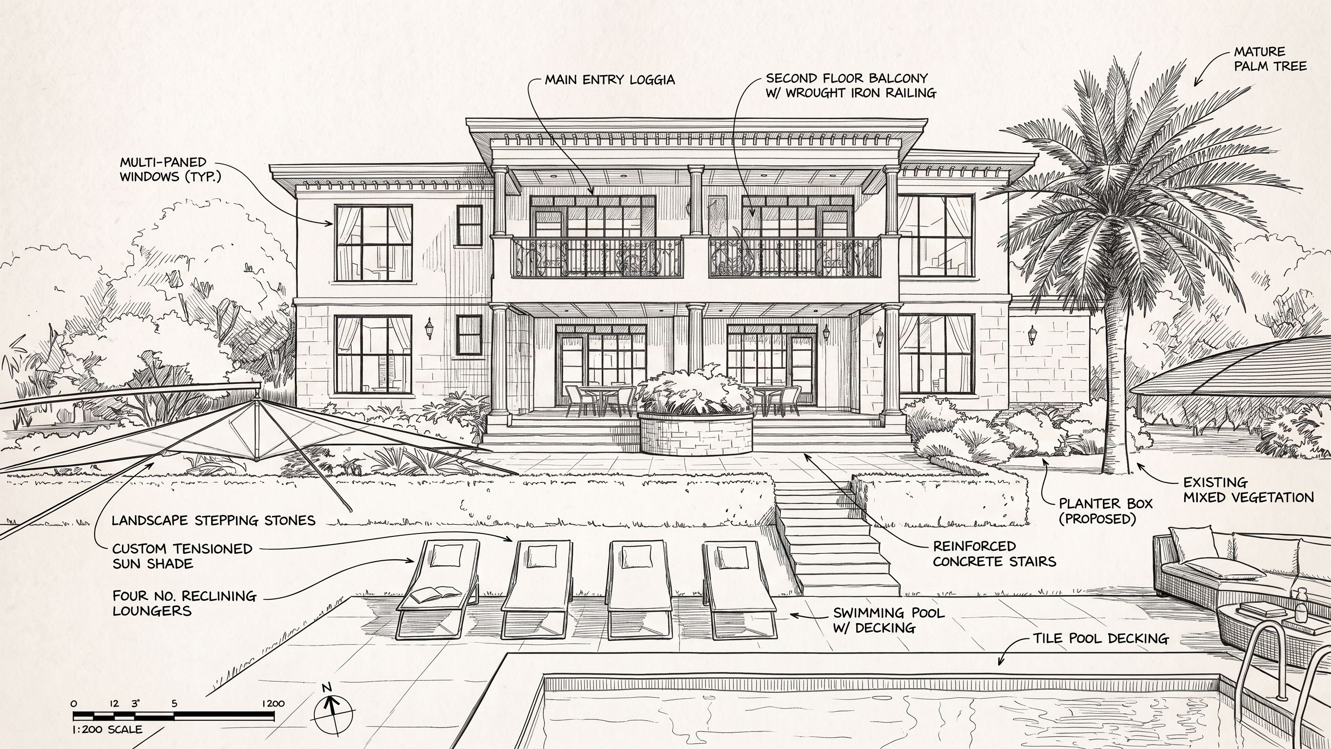 PromptTurn this render into a black and white sketch with annotations, keep exact camera angle