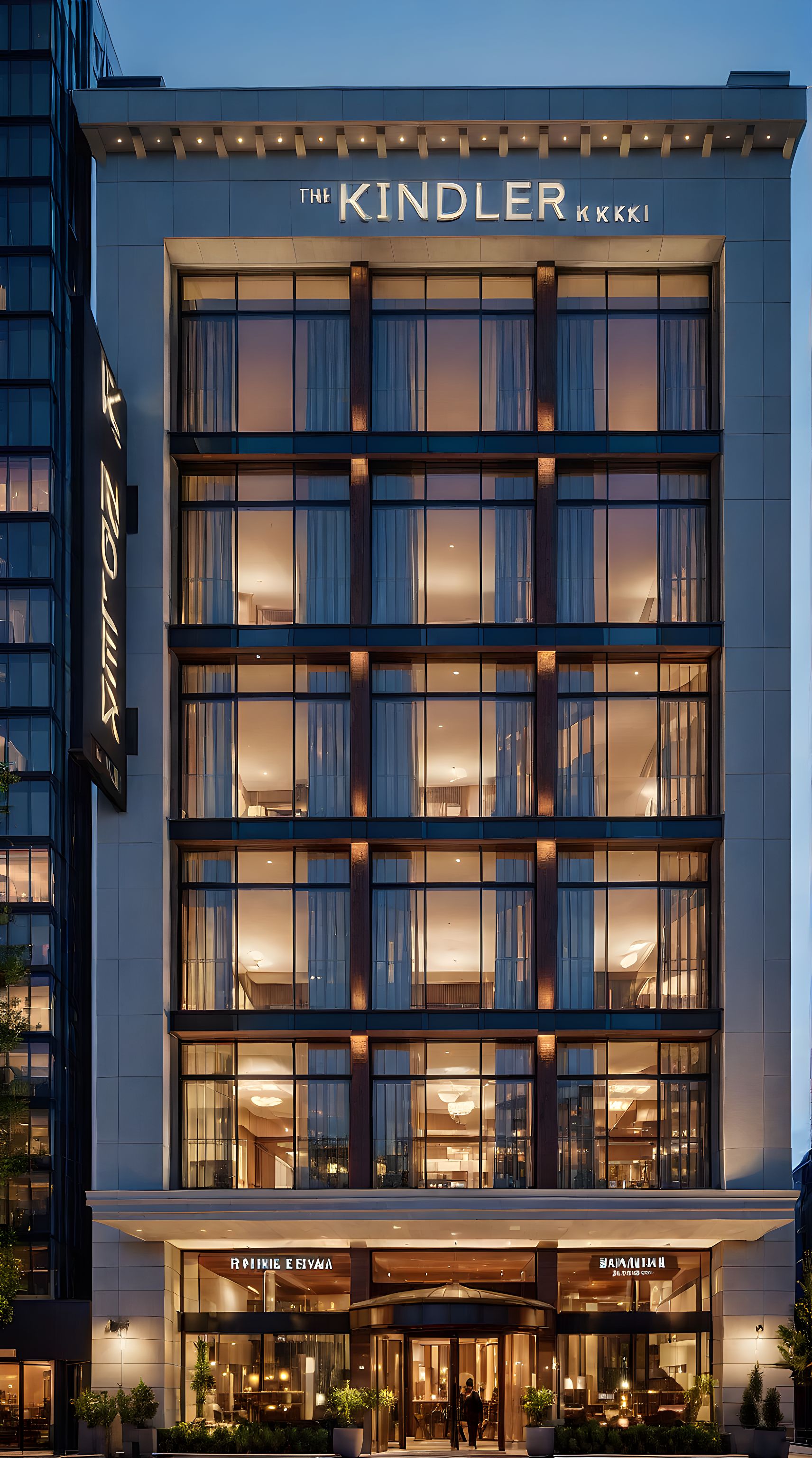 PromptPhoto of a modern hotel facade showcasing a blend of glass and warm wooden elements, emphasizing large windows framed by rich textures. The surrounding urban landscape features adjacent buildings with a vibrant city atmosphere. Soft evening light casts gentle shadows, enhancing architectural details, with an inviting entrance below. Captured from a straight-on perspective with a wide-angle lens to accentuate the vertical lines and create an immersive view of the structure.