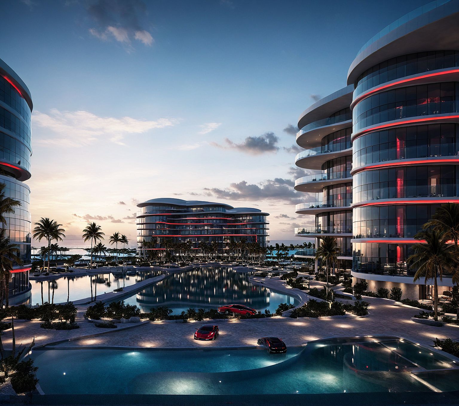 PromptFuturistic render of a Lamborghini-inspired luxury residential complex in Marina Cap Cana, Dominican Republic. glass towers with curved dark gray metallic structures and red LED accents. Surrounded by yachts, water. Set at sunset, warm interior lighting enhances the tropical ambiance. The sea is present both behind and in front of the building, highlighting its exclusive waterfront location.