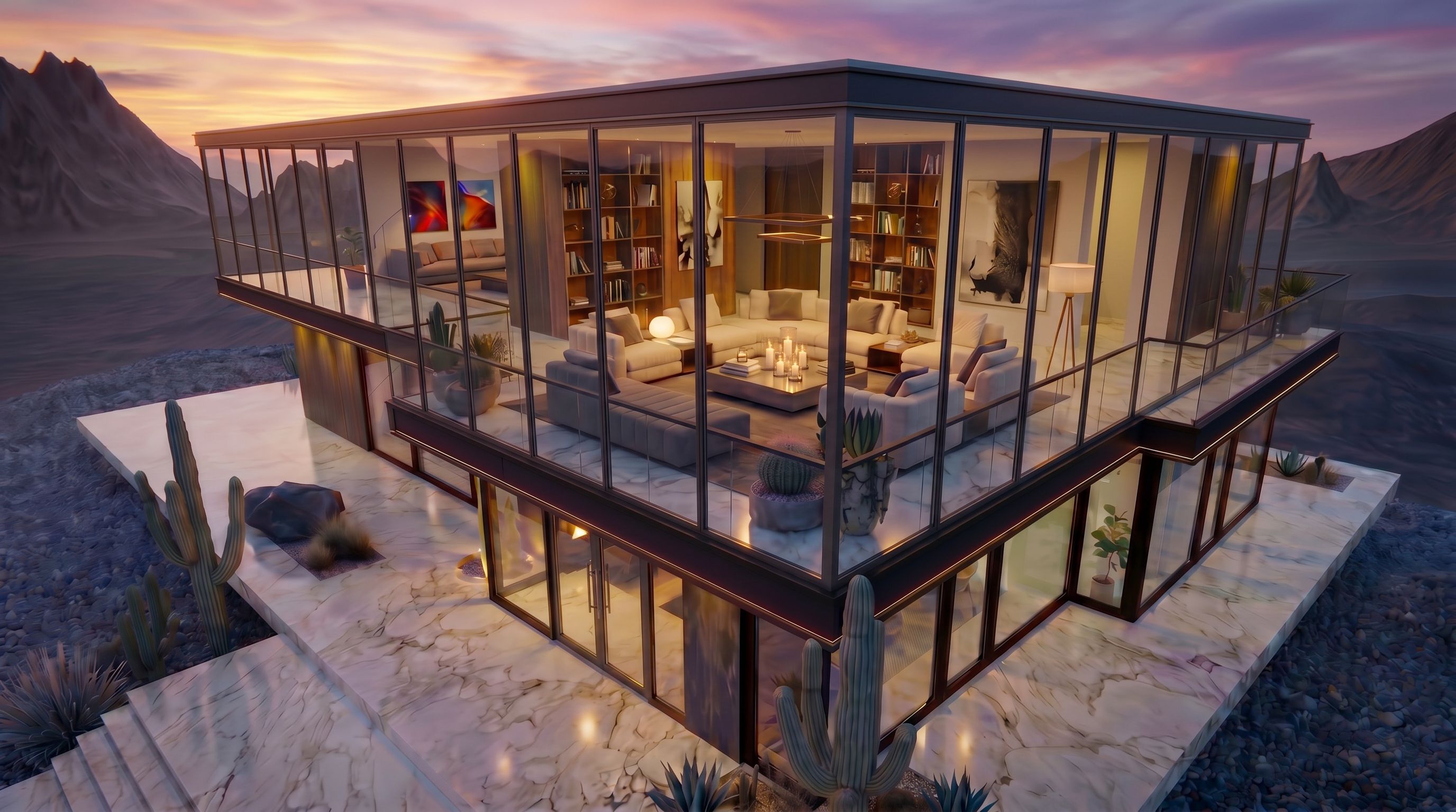 Promptcierra el piso superior con la misma carpintería del piso de abajo dejando dentro del cerramiento todos los muebles y sillones de las diferentes salas de estar y todos los muebles de arriba, keep exact camera angle