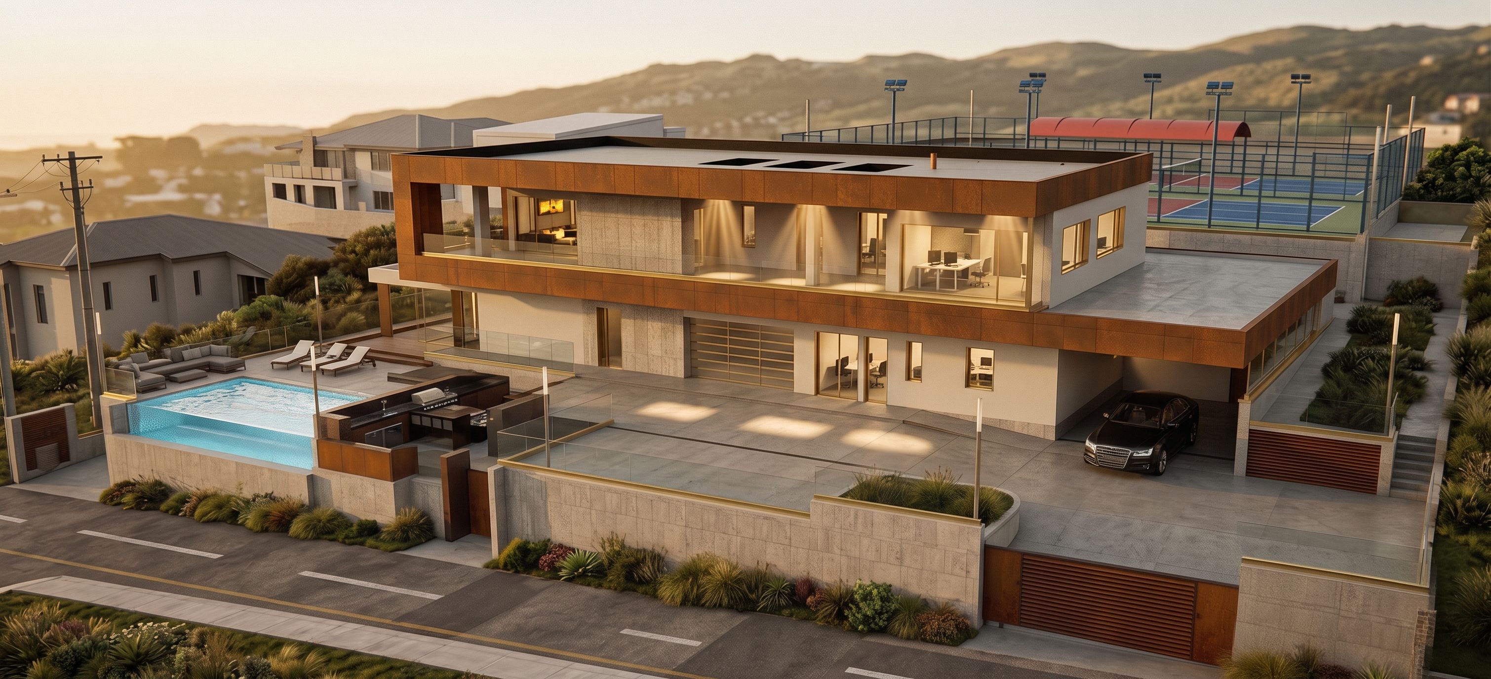 PromptCreate a highly photorealistic, high-resolution image. Use the materials shown in the "reference image1"; There are Corten-effect Alucobond panels; light-colored plaster; glass parapets with a brass-colored aluminum profile underneath; the thin window and French window frames are brass; the volume in the center of the building, visible on the ground and first floors, is clad in concrete-effect tiles. The exterior flooring is industrial concrete; the exterior walls are clad in the same concrete-effect tiles as the building; the horizontally slatted doors seen at the bottom right are made of Corten panels, identical to the Corten cladding of the building; on the first-floor balcony ceiling, there are dark, square-shaped areas, which are square holes that allow light to penetrate from the sky to the first-floor balcony; it shows volumetric rays of light passing through these square holes. The transparent light blue parts are made of clear glass., keep exact camera angle, keep exact camera angle, keep exact camera angle