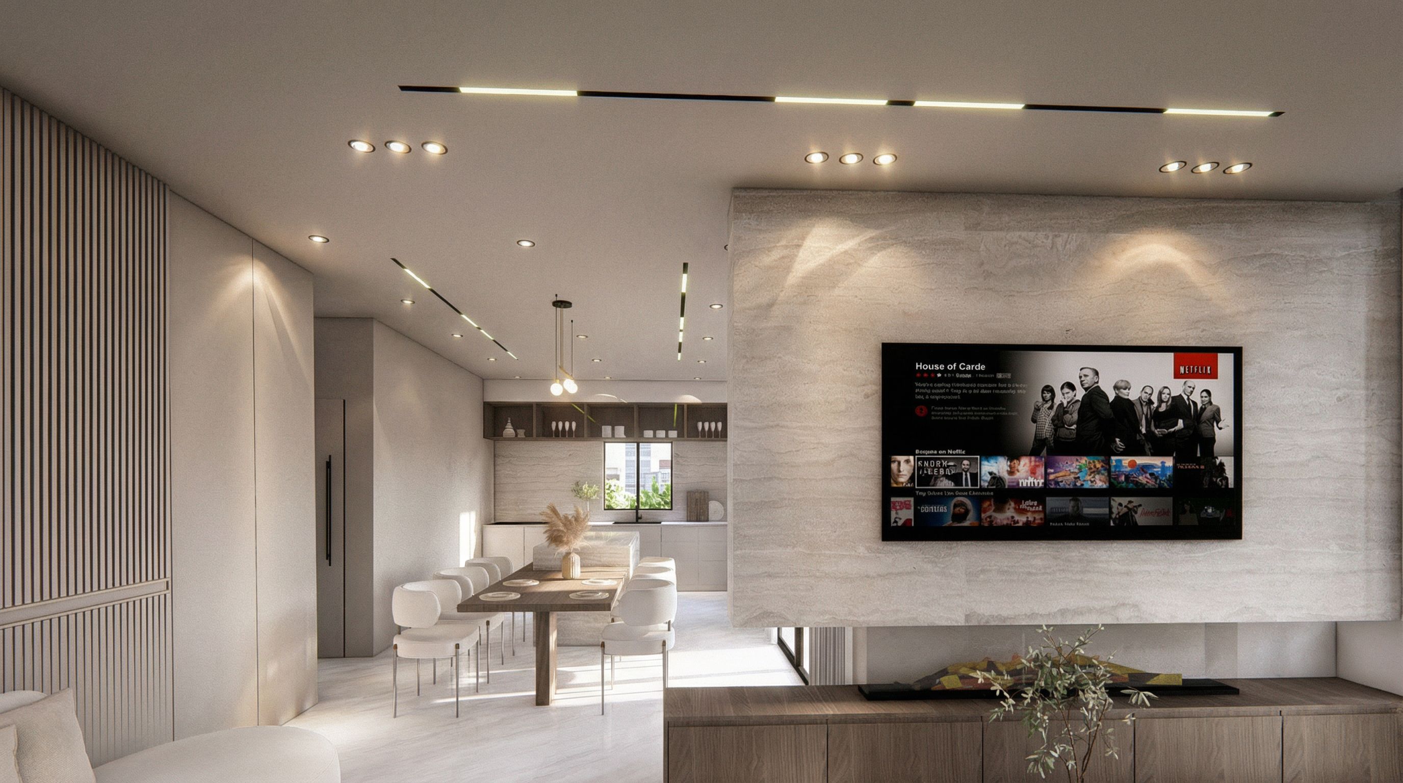 PromptPhoto of a modern interior living space, showcasing minimalistic design elements with sleek lines and a neutral color palette. The room features high-quality materials like polished stone and wood, emphasizing texture and elegance. Urban setting with large windows allowing natural light to flood the space, creating subtle shadows. Soft overhead and accent lighting enhances the inviting atmosphere. Captured from a wide-angle perspective to include both seating and dining areas, highlighting the open floor plan while maintaining a cozy feeling. Rendered in lifelike detail to showcase the sophistication of contemporary architecture., keep exact camera angle