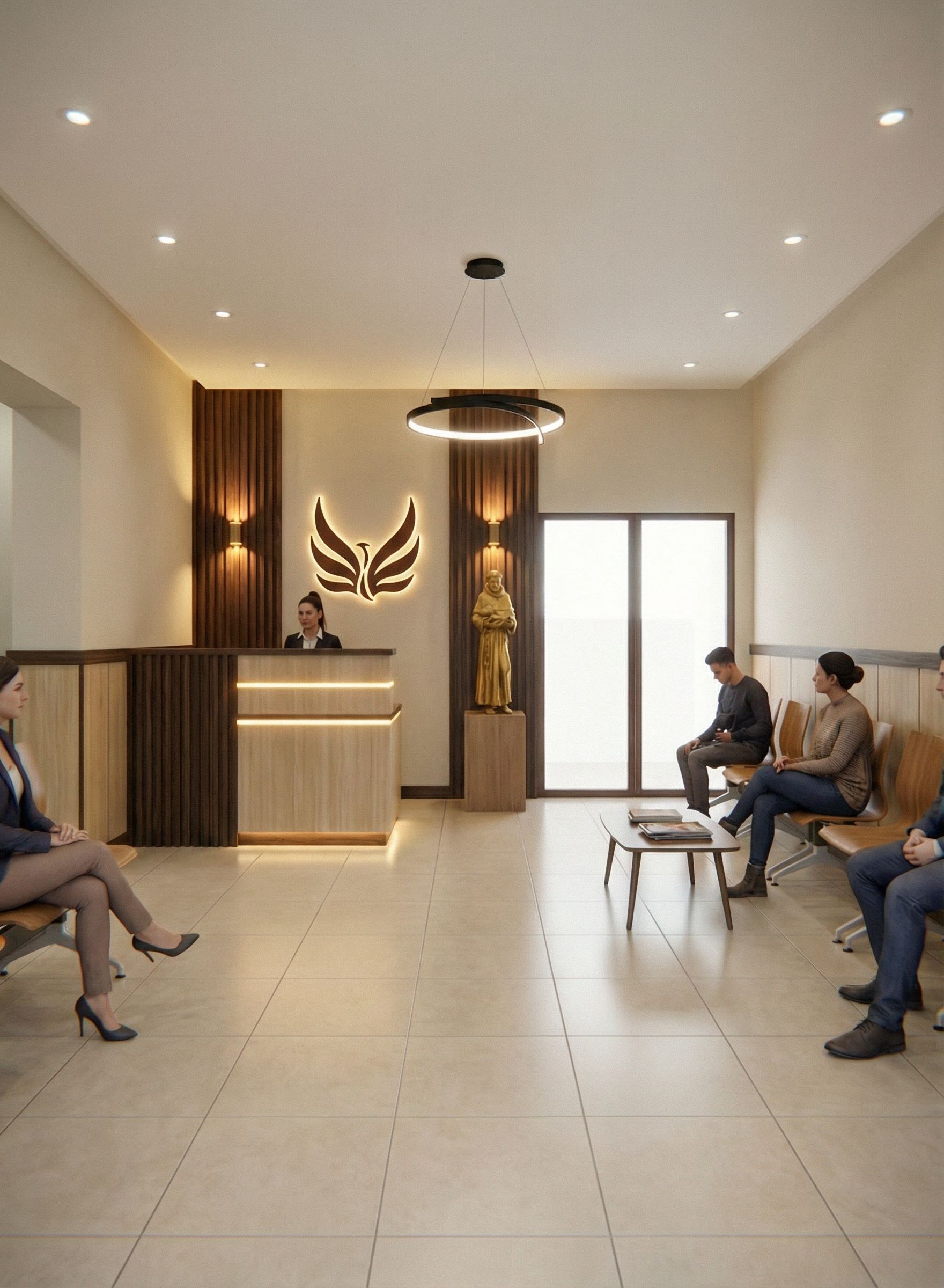 Está todo bien en general, solo quita la estatua más grande, manten la mas pequeña, y sube la altura se su podio a sesenta centimetros. Quita la cinta led del cielo raso del fondo donde están los wall panels. Mejora las luces de acento del mueble de recepción, son mas difuminadas, luz calida, y solo son dos tiras, una en el zocalo y otro en la parte superior del mueble. Los apliques de luces del wall panel solo producen luz en un sentido, hacia abajo, es luz calida. Todo lo demás está bien., keep exact camera angle