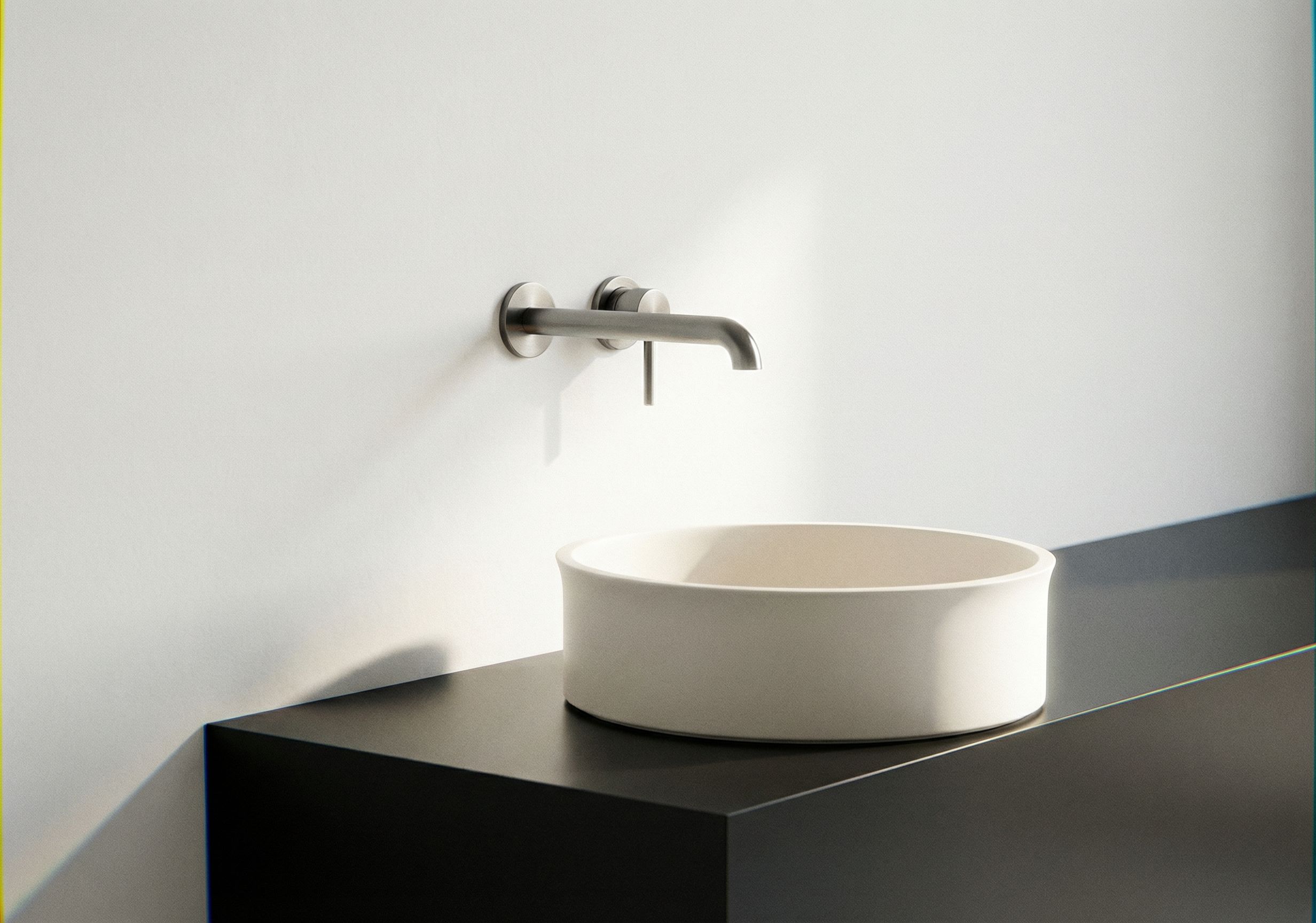 PromptCreate a highly detailed photorealistic image of this washbasin, strictly preserving the exact shape of the original base sketch. Do not modify, reinterpret, smooth, redesign, or alter the geometry in any way. do not modify the camera angle, point of view from the base sketch photo. The proportions, curves, edges, thickness, and profile must remain identical to the sketch. No stylistic reinterpretation is allowed. The silhouette must perfectly match the original drawing. The washbasin is made of matte ceramic in a white warm color, matching exactly the tone of the provided reference image. The surface should have a soft matte finish with realistic ceramic texture and subtle light diffusion. The wall-mounted faucet is brushed stainless steel in black color with a refined satin finish. The washbasin rests on a dark lacquered countertop. The background wall is smooth, plastered, and painted pure white with a seamless finish. Use soft natural lighting, realistic shadows, accurate material reflections, and a minimal contemporary bathroom setting. Focus on material realism and precise geometry fidelity. Ultra-realistic render, high resolution, professional interior photography style., keep exact camera angle