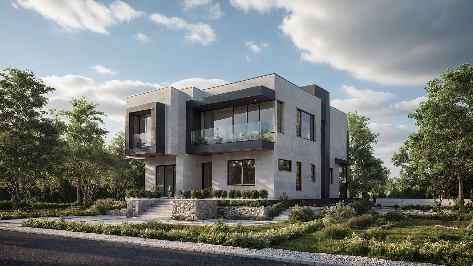 PromptDetailed photo of a modern villa, daylight mood, stone facade, add relevant vegetation and flowers, add people where necessary, dramatic clouds