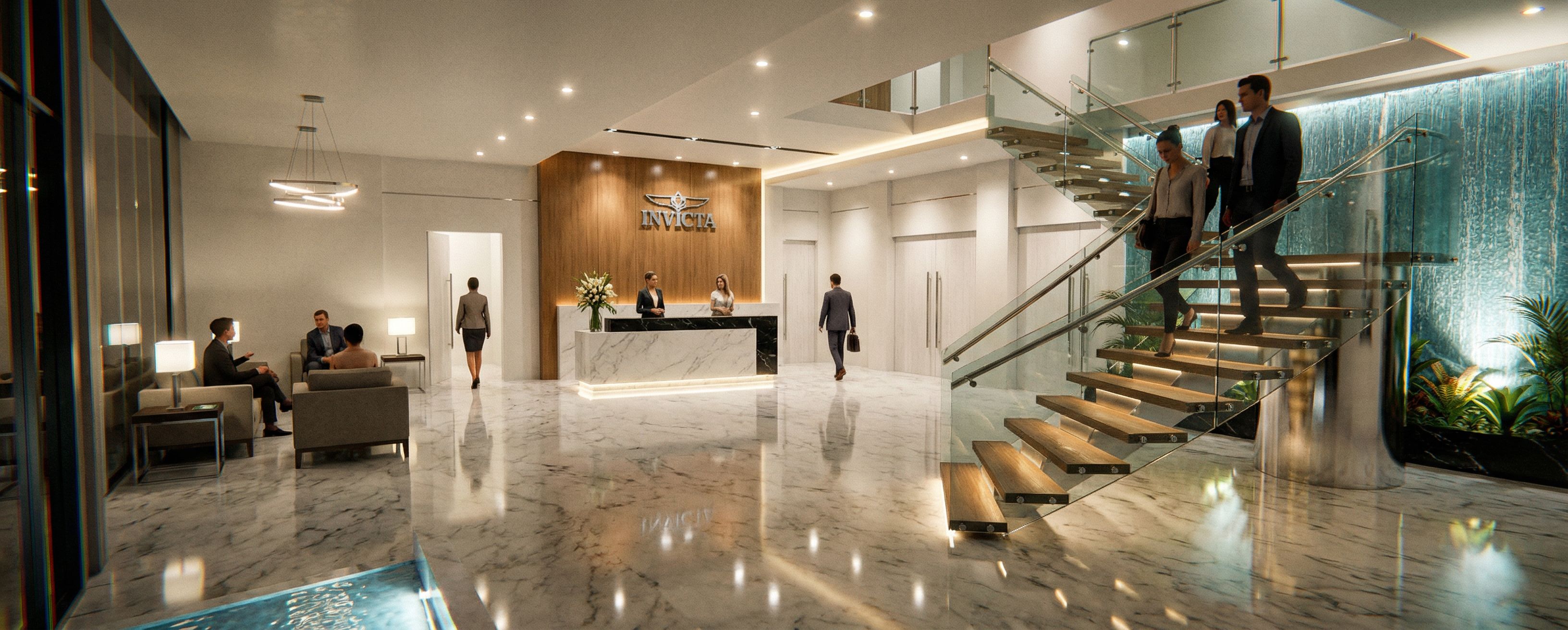 LOBBY CON PISO EN MARMOL CARRARA BRILLANTE, CORTINA DE AGUA EN LA PARED DE LA DERECHA CON UNA JARDINERA EN LA PARTE INFERIOR CON REFLECTORES , MOSTRADOR DEL LOBBY EN MARMOL BLANCO CON LA PARTE SUPERIOR EN MARMOL NEGRO Y PARED DE FONDO EN MADERA SEMI BRILLANTE CON EL LOGO DE INVICTA EN ACERO BRILLANTE, JARRON CON FLORES ENCIMA DEL MOSTRADOR ,ESCALERA CON BARANDA EN VIDRIO Y HERRAJES EN ACERO INOXIDABLE, COLUMNA DE LA ESCALERA EN ACERO BRILLANTE, ESCALONES EN MADERA BRILLANTE, MOSTRADOR DEL LOBBY CON ILUMINACION EN LA BASE. LUMINARIAS MODERNAS EN EL AMBIENTE. LAMPARAS LED EN EL RESTO DEL TECHO, EN LOS VANOS ABIERTOS MOSTRAR PUERTAS EN MADERA BLANCA CON MANIJAS VERTICALES EN ACERO BRILLANTE, MOSTRAR DOS MUJERES BELLAS Y ELEGANTES ATENDIENDO ATRAS DEL MOSTRADOR, MOSTRAR UN JUEGO DE SOFAS CON MESAS AUXILIARES CON PANTALLAS PRENDIDAS, CON PERSONAS SENTADAS A LA IZQUIERDA DEL AMBIENTE, 3 PERSONAS BAJANDO LAS ESCALERAS, PERSONAS CAMINANDO POR EL AMBIENTE, ESCALON CENTRAL DE LA ESCALERA CON LUZ POR DEBAJO. CONCERVAR EL PUNTO DE VISTA SIN HACER NINGUNA ALTERACION EN LA POSICION DE NADA., keep exact camera angle