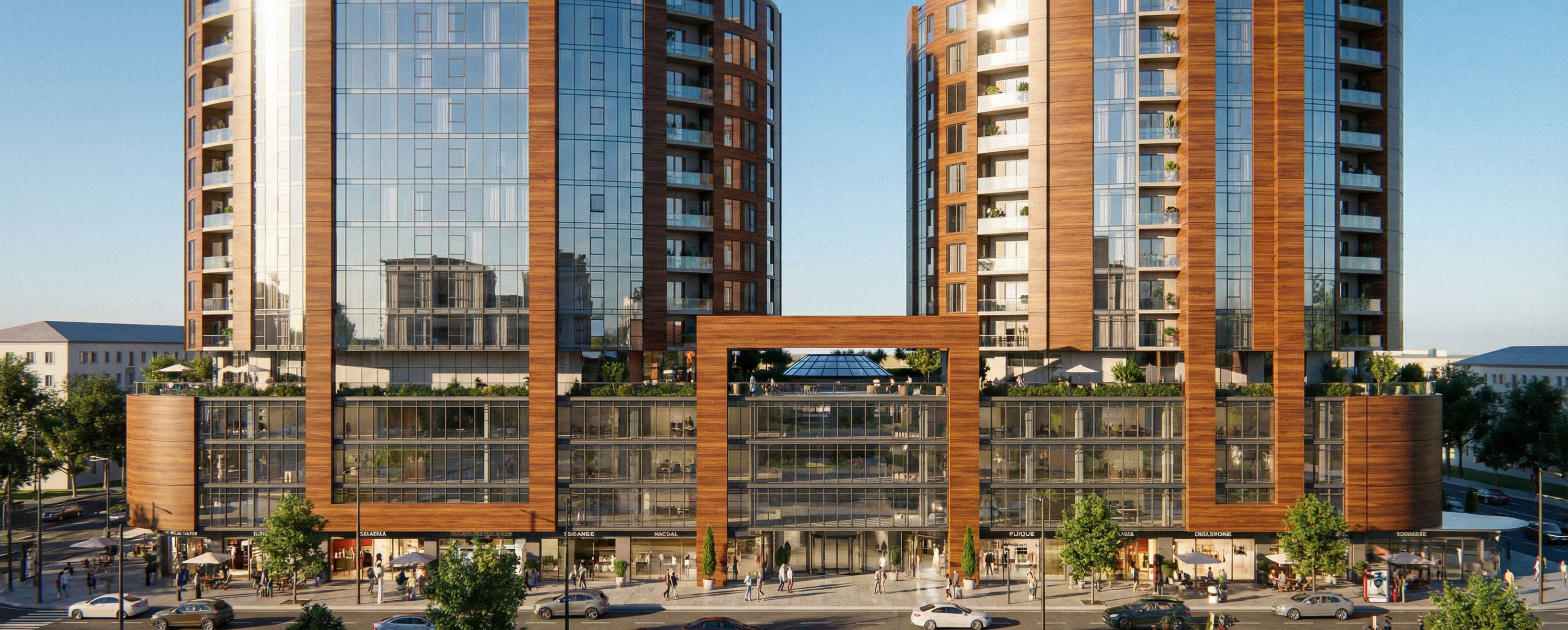 PromptTHE PODIUM IS A 4 STORIES AND A ROOF MALL... ND THE TWO TOWERS ARE 10 STORIES RESIDENTAIL .. THE CLADDING IS GLASS AND WOOD MAKE IT SUPER REALISTIC AND ALIVE, keep exact camera angle