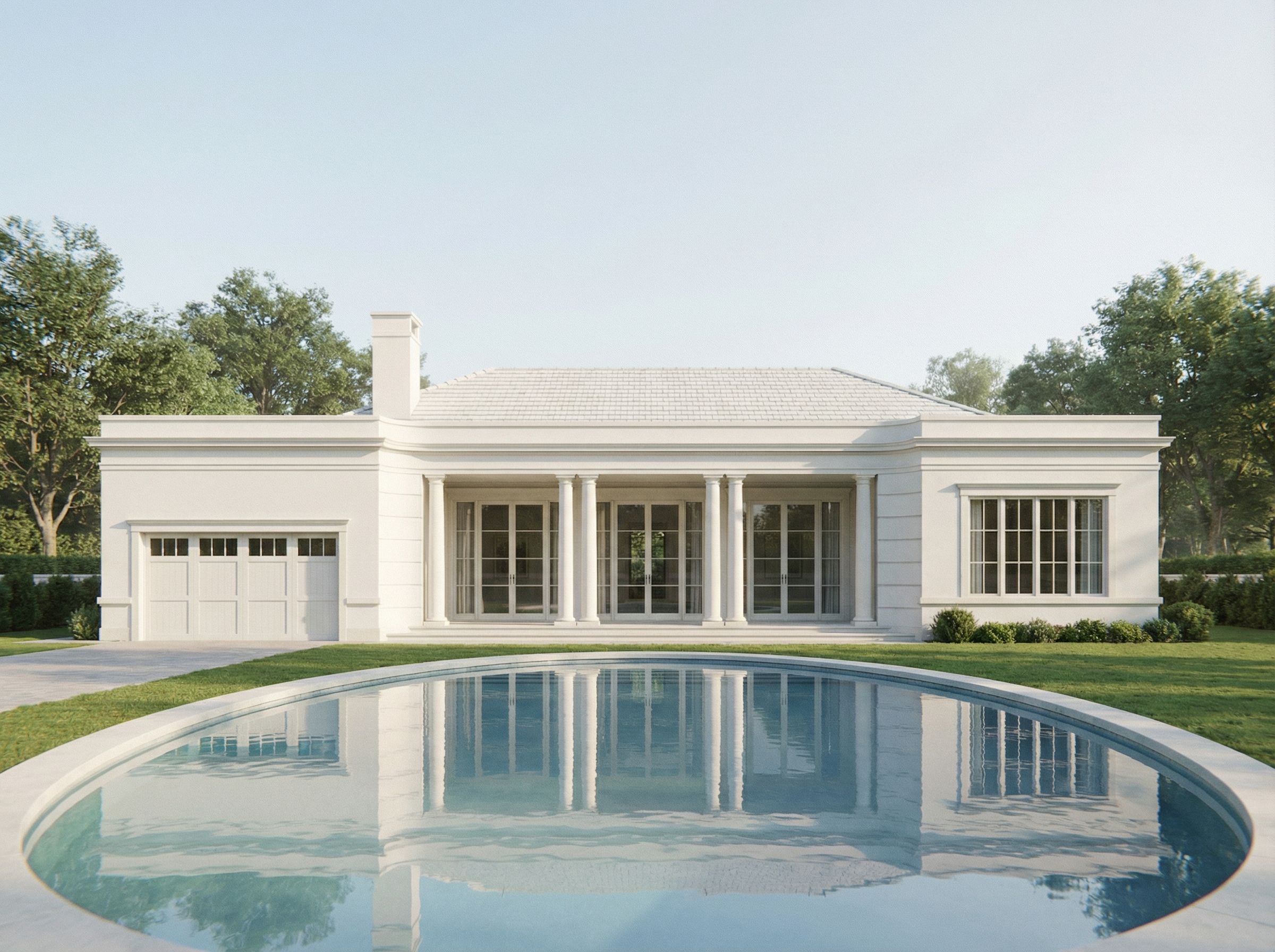 Ultra-photorealistic architectural exterior render of a Regency / Neo-Palladian style residence with strict symmetry and equal proportions throughout the massing. Facade is classically ordered, balanced, and restrained, emphasizing harmony and hierarchy rather than ornament. The rear facade is perfectly symmetrical and composed of three primary sections: a dominant central mass and two identical flanking wings. The flanking wings extend 8 feet forward from the face of the columns in the center loggia, maintaining equal proportions on both sides. the flanking sides total depth is 20ft. it forms a C shape and the depth should of the flanking wings should be noticeable. the wing on the left of the image is a garage. A covered loggia is centered on the rear elevation, projecting from the central mass and measuring approximately 12 feet deep. The loggia is classical and restrained, aligned with the building’s primary axis. The walls of the two flanking wings subtly concave inward toward the columns of the loggia, creating a gentle inward curvature that emphasizes the central axis while remaining symmetrical and refined. the roof pieces on the two flanking sides are flat. and the apex of the roof is only 4ft high. there is an oval shaped pool in the center. the major axis of the oval should run left to right. ;the massing of the house should be as i describes. the depth should be noticeable with shadows. it should feel lively and not like a flat facade. Quiet, disciplined composition with emphasis on proportion over ornament. Strictly classical proportions; no contemporary simplifications. Elevation accurately follows the provided sketch and architectural intent. Exterior material is smooth white stucco with subtle natural variation and realistic surface texture. Cast stone sills and headers are near-white, just slightly warmer than the stucco body, crisp and refined with clean profiles and delicate shadow lines. Windows feature only a header and sill—no full surrounds or casing Roof is a white-to-light-grey concrete tile, matte finish, clean and uniform with realistic scale and weight. Openings are perfectly aligned vertically and horizontally, maintaining a calm, even rhythm Soft natural daylight with a slightly cinematic, dreamy atmosphere—gentle haze, softened highlights, and delicate contrast while maintaining photorealism. Realistic global illumination and true shadows. Camera at human eye level, straight-on elevation or very subtle perspective, show entirety of house. 40–45mm lens, professional architectural photography composition. Glass is clear with soft reflections and interior depth—never flat or overly glossy. Render quality comparable to high-end architectural photography, timeless, refined, and quietly cinematic. Background environment is realistic and contextually appropriate. Render quality comparable to professional architectural photography, 8K detail, cinematic realism, keep exact camera angle