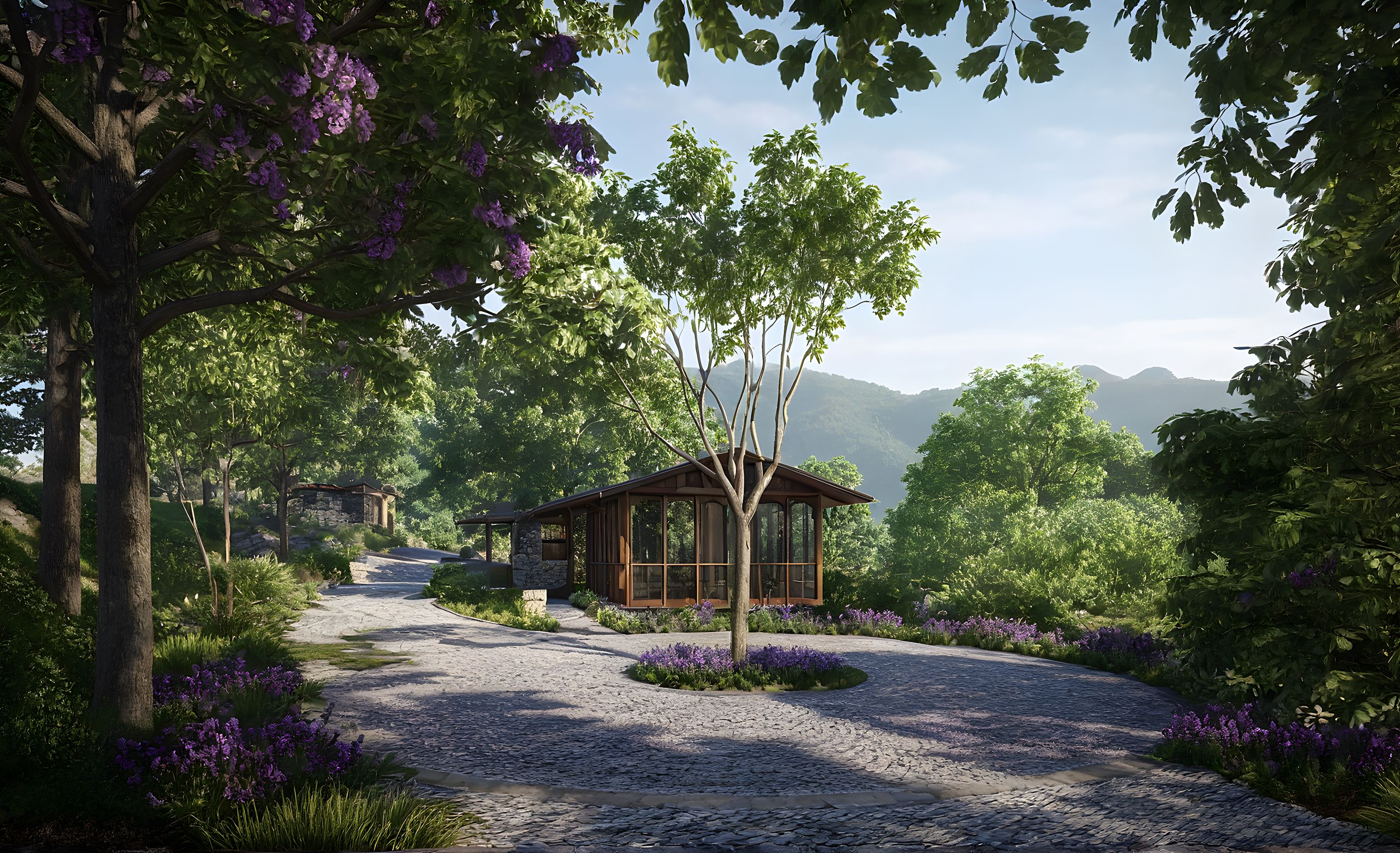 PromptGenerate a hyper-realistic morning render of a mountain resort arrival pavilion viewed from a curved cobblestone path with slight reflection. Preserve the architectural design, detailing, materials, and finishes exactly as shown. The landscape should feel intentional and well-maintained: lush with orderly planting along the path edges, soft grasses, and a mix of native and decorative foliage. Trees should retain their current density, placement, and species. Light should evoke a calm, welcoming morning atmosphere with long shadows, soft ambient glow, and subtle light filtering through the canopy. focus instead on clarity, realism, and visual warmth that invites the viewer in. more defined cobble stone texture on the floor. The purple flowers and lush greenery should remain vibrant but natural, contributing to the morning freshness.