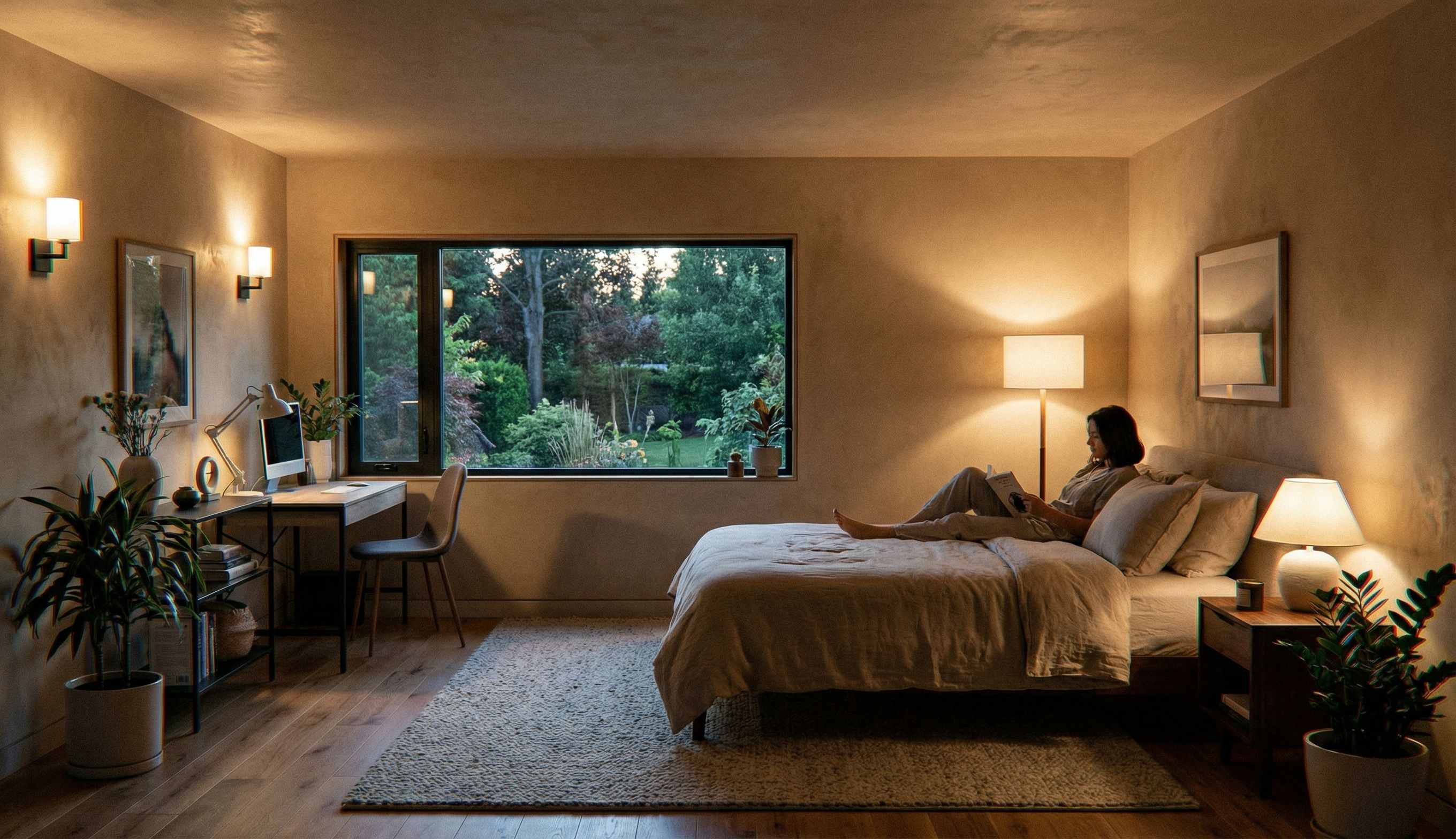 Promptmodern second floor bedroom, hardwood floors and area carpet, venetian plaster walls and ceilings, ooking out to trees and garden, work desk or queen bed in front of window. Follow room geometry , keep exact camera angle