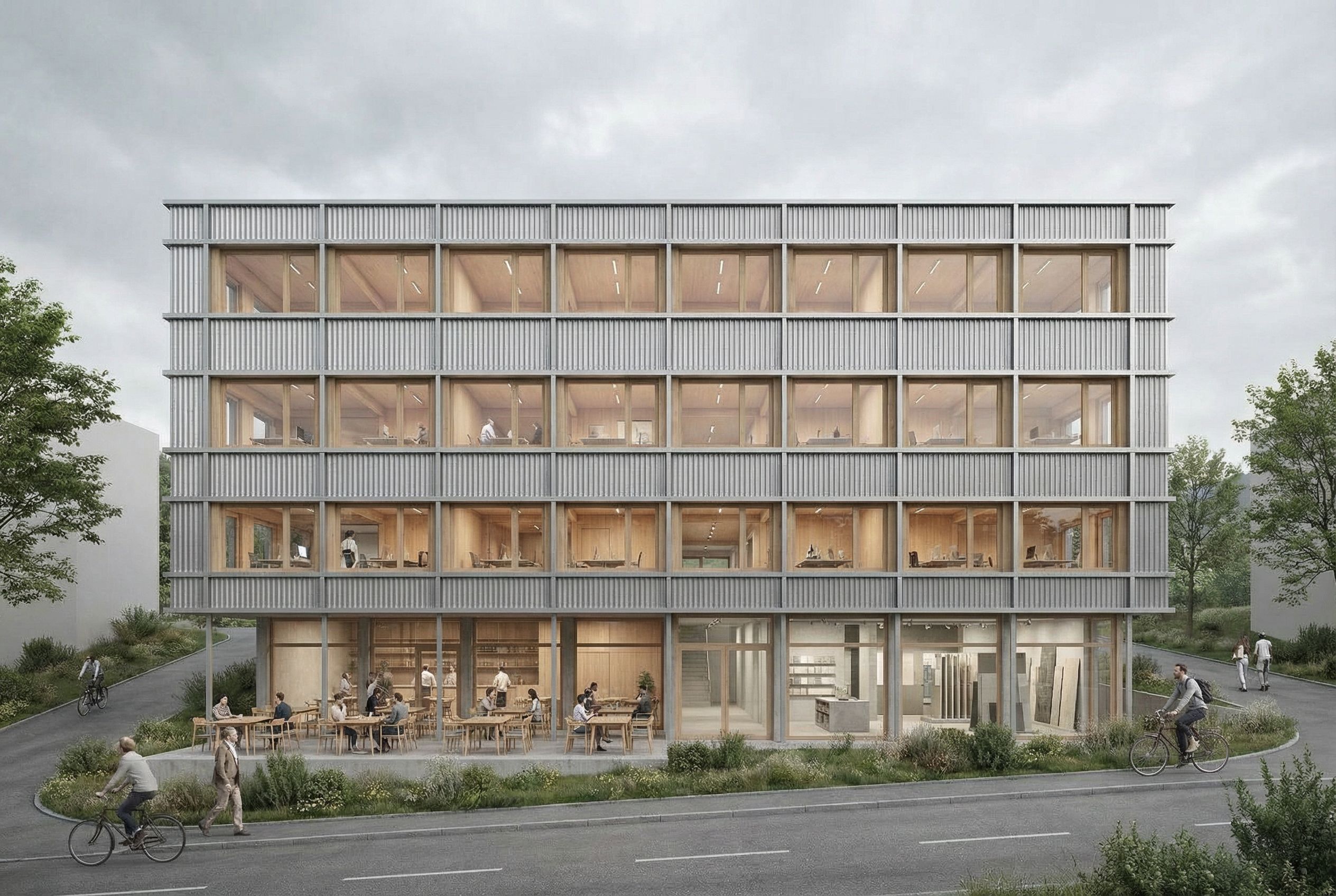 architectural exterior rendering, render this photo into photorealistic rendering, Bitte erstelle auf Grundlage des hochgeladenen Gebäudes eine hochwertige Architekturvisualisierung. Orientiere dich mit der Geometrie und den verwendeten Materialien und Farben so präzise wie möglich an dem hochgeladenen Foto. die horizontalen und vertikalen lisenen sollen aus matten Metall sein. die zwischenräume aus gelochtem wellblech. fenster mit holzrahmen, im inneren soll eine warme stimmung herschen mit viel holz. in den drei obergeschossen ist bürobau untergebracht, im erdgeschoss gastronomie auf der linken hälfte, auf der rechten hälfte eine fliesenausstellung. die ersten 4 rasterfelder von links im erdgeschoss soll eine außenterrasse sein. die grünbereiche im außenbereich sollen dezent begrünt sein und sich am originalbild orientieren. bitte rendering am tag und mit bewölter stimmung, eye level view, including people, greenery and vegetation, high quality, professional, detailed scene