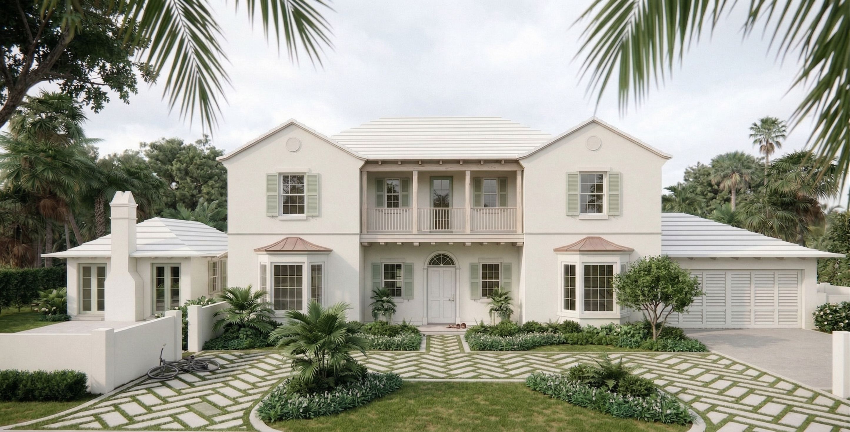 PromptUltra-photorealistic enhancement of the provided image. Do NOT change the architecture, massing, proportions, openings, materials, colors, roof, windows, doors, or camera view in any way. Keep everything exactly the same. Do NOT alter or redesign any hardscape (driveway, walkways, paving pattern, or layout must remain identical). ONLY enhance and redesign the landscaping. Planting bed locations MAY be adjusted or expanded, but must feel intentional and integrated with the existing hardscape layout. Create a high-end Palm Beach residential landscape design with a lush, layered composition: Defined planting beds with clean but slightly softened edges Rich groundcovers filling beds (no exposed dirt) Layered shrubs with varied heights for depth A few elegant focal plants (palms, sculptural tropicals, or small specimen trees) Improve composition: Strengthen entry sequence leading to the front door Add balanced planting around the central lawn Enhance corners and edges of the house with fuller planting masses Create a more cohesive flow between left and right sides Keep it refined and residential: Not overly dense or jungle-like Avoid blocking architecture Maintain clear views to doors and windows Enhance realism: Natural variation in plant tones (deep greens, muted greens) Soft, realistic shadows within planting beds Slight imperfections for a believable, lived-in feel Keep the lawn healthy and slightly richer in texture, but natural. Lighting should remain soft, evenly diffused, and consistent with the original image. Final result should feel like a luxurious, professionally designed Palm Beach home landscape — elevated, cohesive, and realistic — while keeping the architecture and hardscape completely unchanged., keep exact camera angle