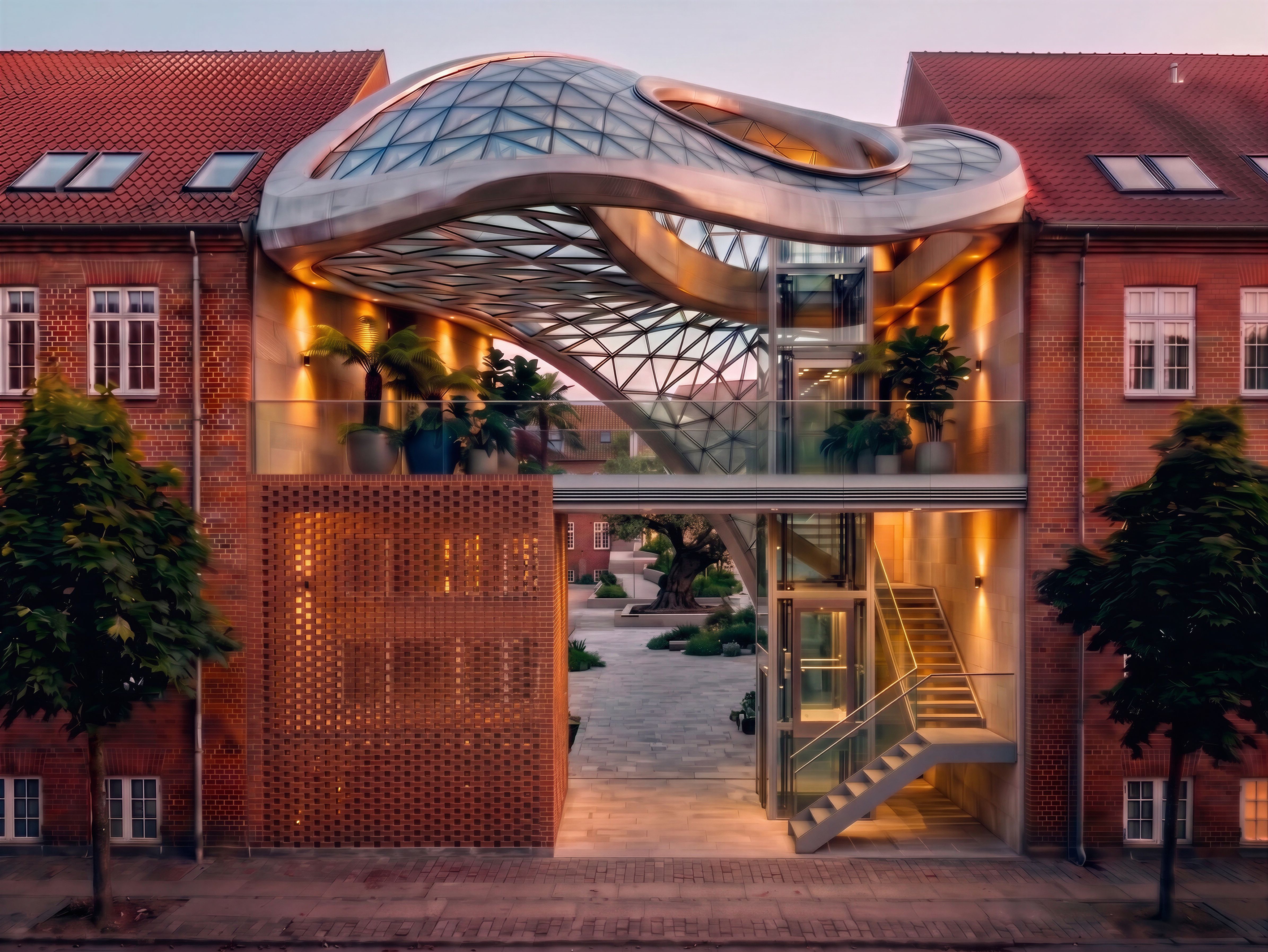 Edit this image. Insert a perforated red brick wall on the ground floor, as in "Reference Image 1." Move the ground floor stone steps to the right, attaching them to the right wall, so that the perforated brick wall is on the left and the passage with exposed steps is on the right., keep exact camera angle