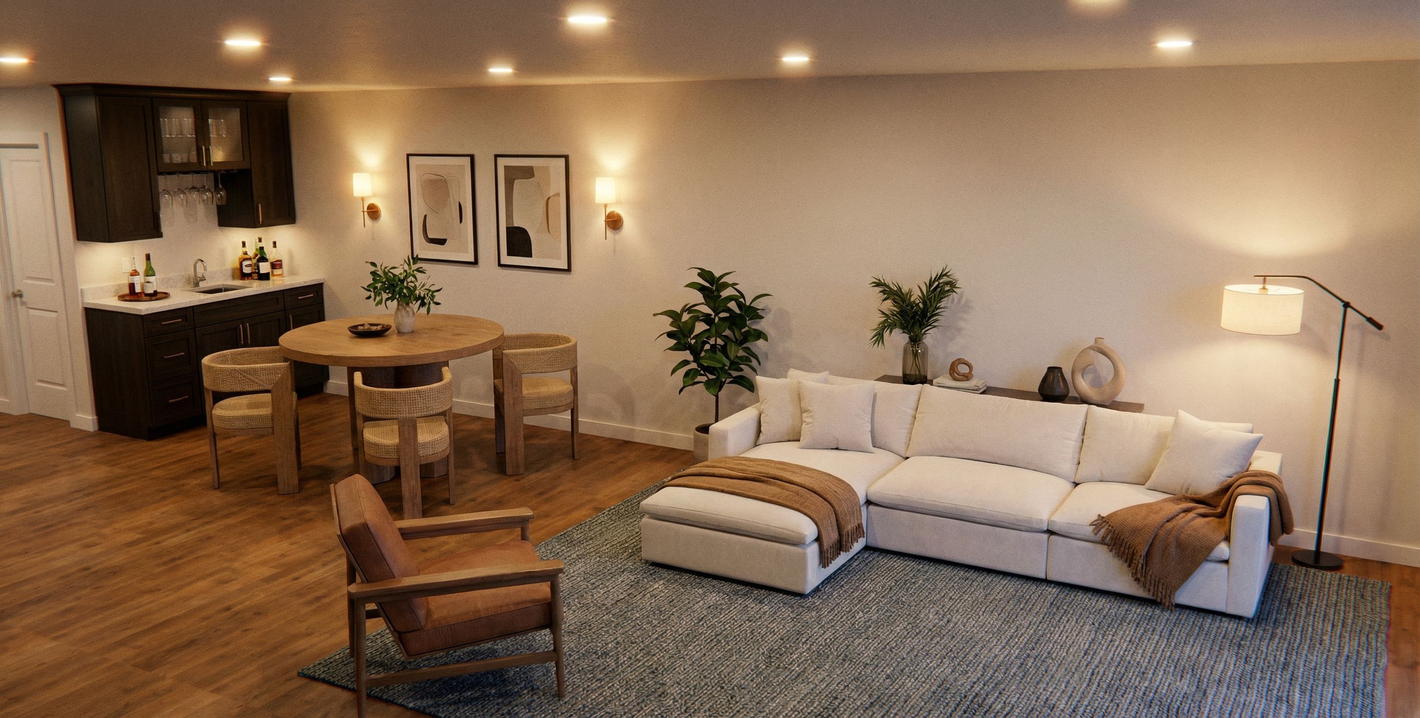 PromptPhoto of a cozy, modern basement living space featuring an open-concept design. Highlight the stylish sofa with soft cushions, a minimalist wooden dining table surrounded by sturdy chairs, and a sleek bar with dark cabinetry. Emphasize warm wooden flooring and a textured area rug. 6 overhead pot lights that are on, cozy wall lighting or lamps, Capture the scene from a slightly elevated angle, using a wide-angle lens to enhance the spaciousness and inviting atmosphere of the interior., keep exact camera angle