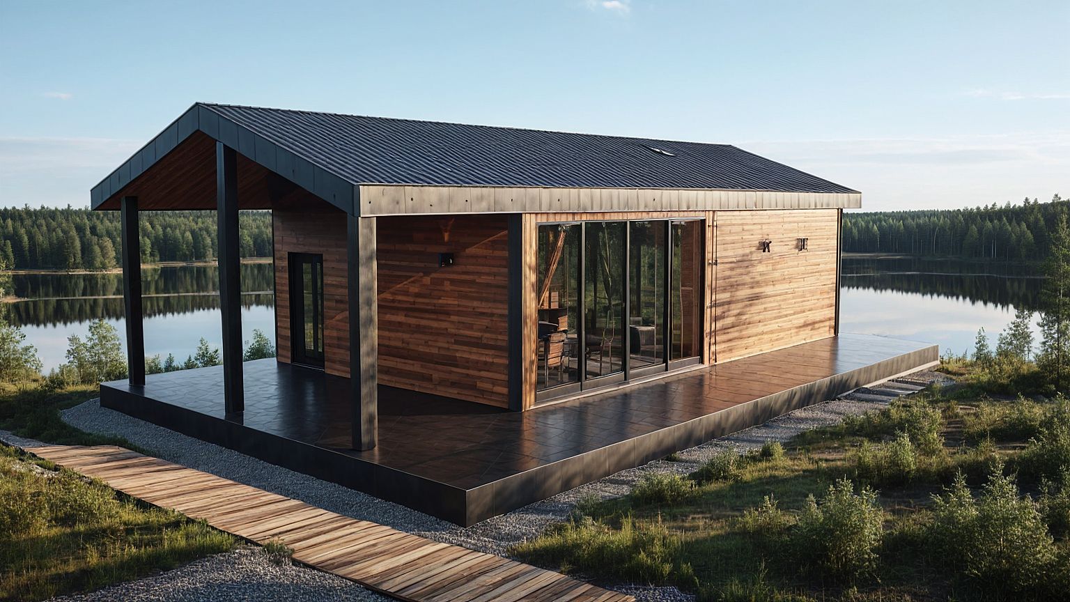 PromptA modern barnhouse with iron sheets and wooden planks. A forest and a lake in background.