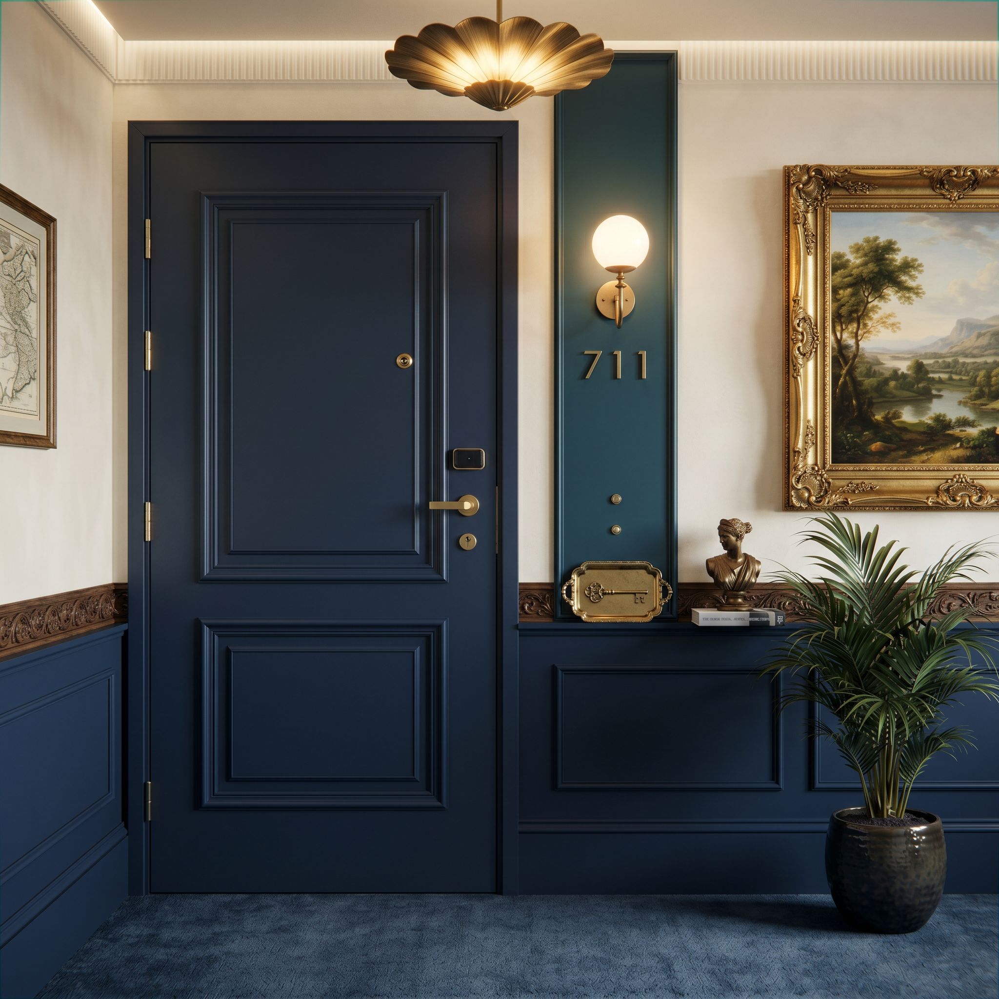 PromptMake the light blue area of the wall a creamy white. Change the large painting to be similar to the one in the reference image. add a band of decorative dark moulding at chair rail height. change the ceiling fixture to be similar to the gold one in the reference image. change the sconce to be the globe sconce in the reference image., keep exact camera angle