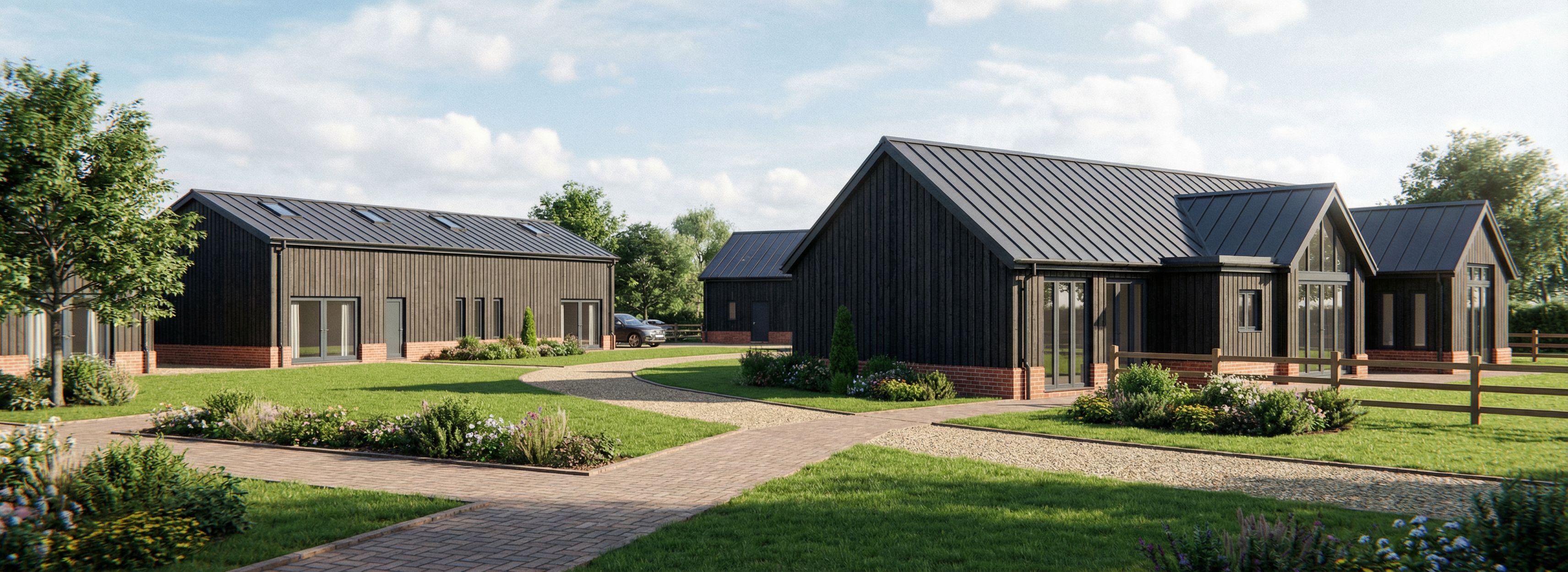 Promptbarn style, dark vertical timber cladding, red brick plinth, metal modern roof, keep exact camera angle