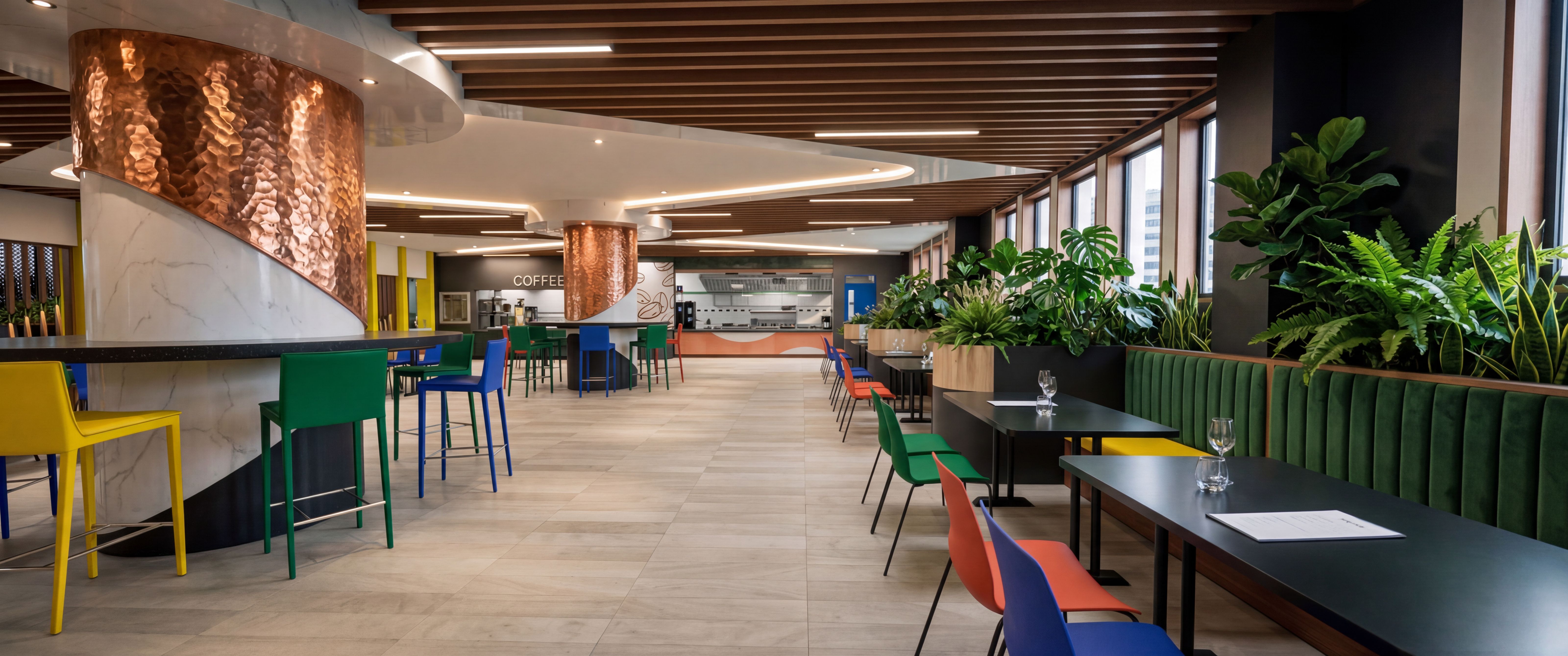 Promptenhance this image, make it more realistic, enhance the plants make them more full, do not add new furniture or lighting fixtures. enhance the textures, enhance the hammered copper texture on the two round columns, keep exact camera angle