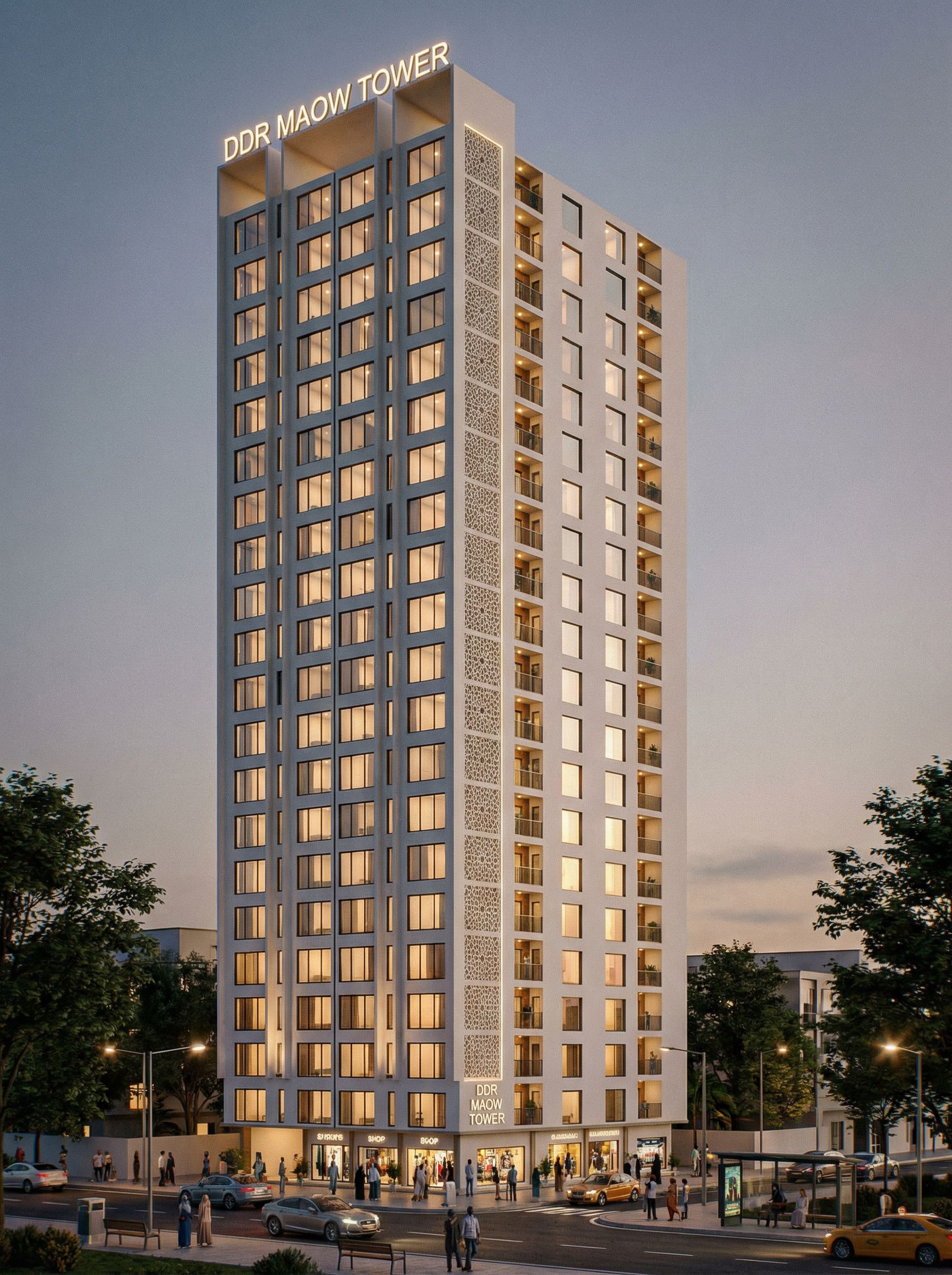 A RESIDENTIAL DEVELOPMENT WITH GROUND FLOOR AS COMMERCIAL AND 20 STORIES APARTMENT COMPLEX. MAKE GLASS CLEAR , REFLECTIVE AND REALISTIC. TURN ON THE LIGHTS IN THE BUILDING. USE WHITE WALL MASTER ON THE BUILDING. MAKE THE BUILDING TO HAVE A CONTEMPORARY ARABIC CONCEPT. WRITE THE NAMES "DDR MAOW TOWER" ON THE BUILDING. INCLUDE PEOPLE OF SOMALI AND AFRICAN ORIGIN IN THE IMAGE. SHOW WHOLE BUILDING. MAKE IMAGE HIGH RESOLUTION OF 8K., keep exact camera angle